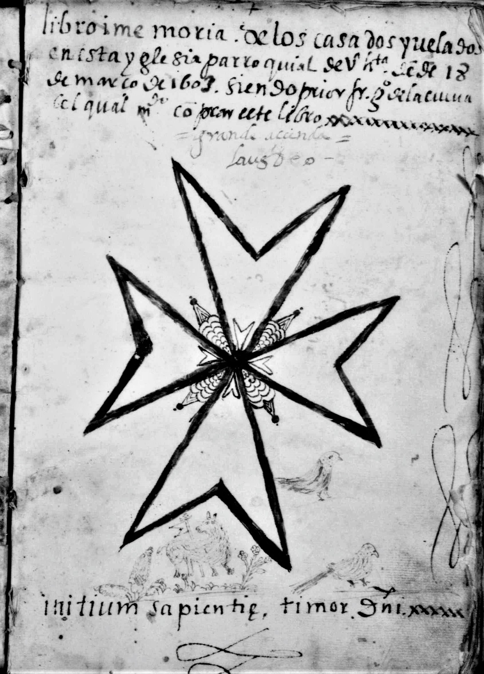 En la imagen anterior figura la portada o primera imagen del Primer libro de Matrimonio de la Parroquia de Villarta de San Juan. En ella se incluye el siguiente texto: «libro i memoria de los casados y velados en esta yglesia parroquial de V hª desde 18 de março de 1603 siendo prior fr. Gº de la cueva el qual mando comprar este libro. =grande acienda= Laus Deo. Initium sapientie timor Dni»