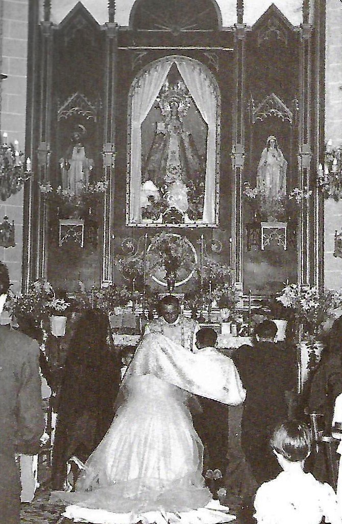 Ceremonia de Velaciones ante el altar mayor de la Virgen de la Paz en su antigua ermita (Fuente: Historia de un pueblo y su gente)