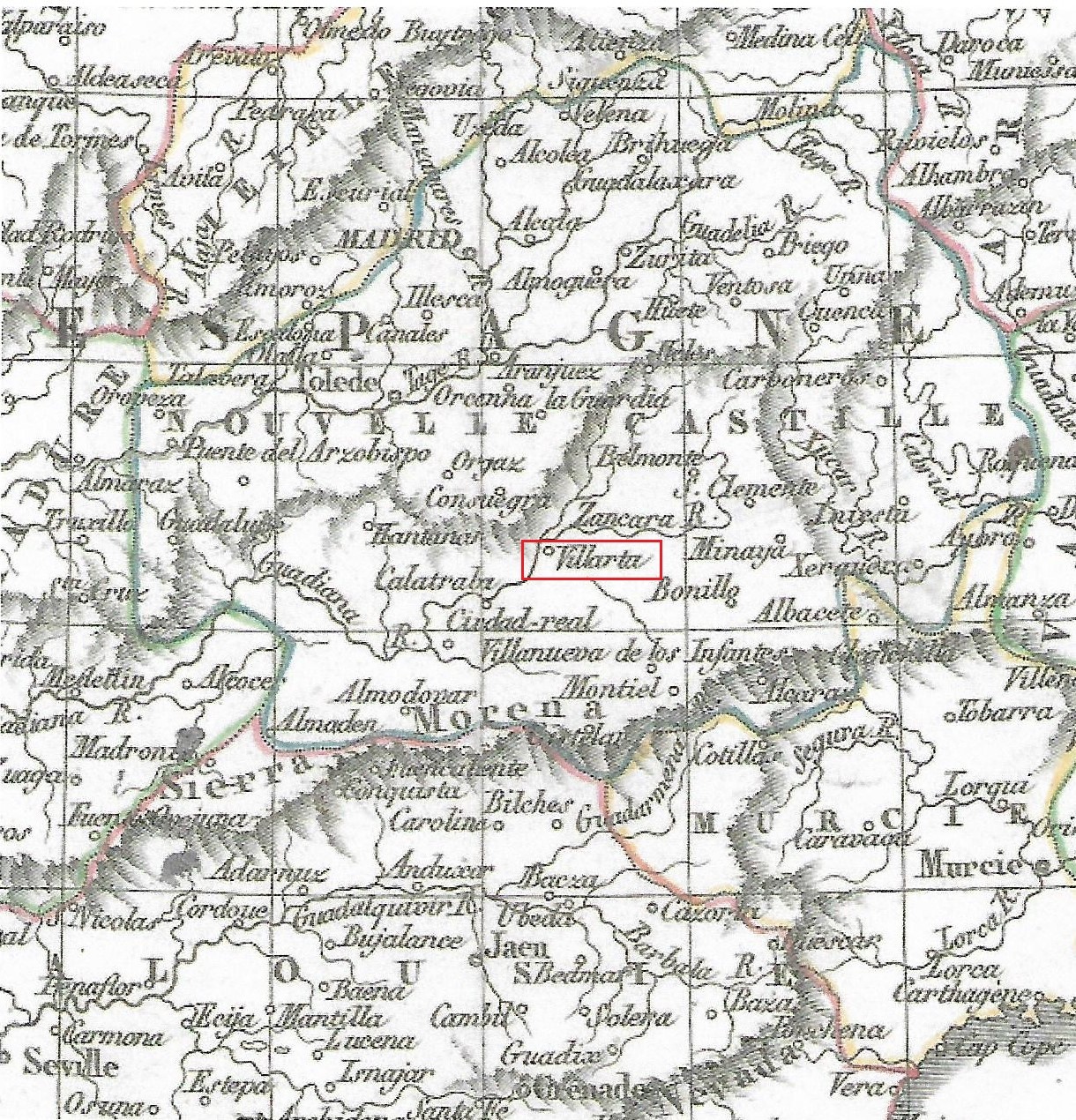 El mapa que hemos incorporado anteriormente tiene en su parte inferior una lectura que nos precisa claramente la fecha en que está hecho, concretamente en Valdepeñas el 1º de noviembre de 1809 y está reproducido en la obra del Comandante Balagny, titulada Campagne d’Espagne, T. V y en él nos muestra el itinerarior del Primer Cuerpo Francés al Sureste de Madrid. Queremos indicar con esto en que los datos que figuran en el anterior mapa, están actualizados y se corresponden con la actualidad que contemplaban los ejércitos franceses. Solo hay que señalar que la única equivocación que encontramos es que a Villarta se le identifique como Villalta. [Esta indicación bastante frecuente en las obras editadas en Francia nos ha hecho que al realizar la busqueda de lugares como Villarta o Villaharta, y no Villalta no nos haya dado ninguna vista, sin embargo en la lectura posterior del libro aparece nuestra localidad con el citado nombre de Villalta.]