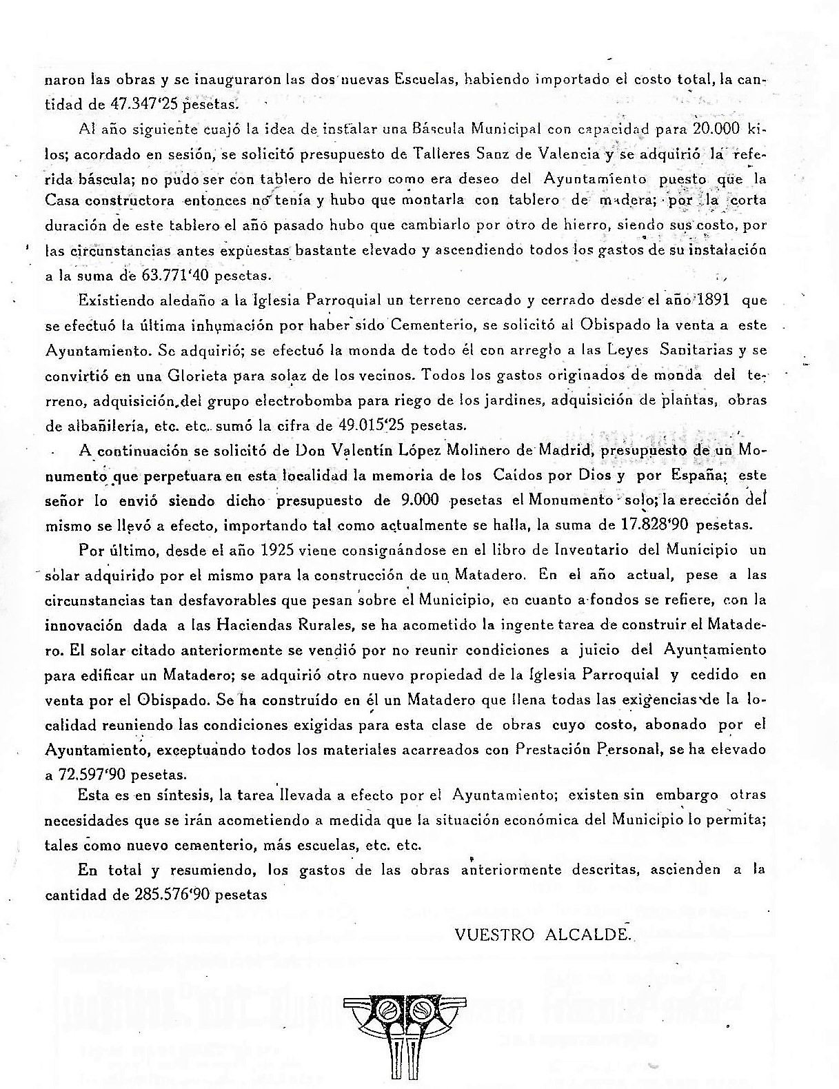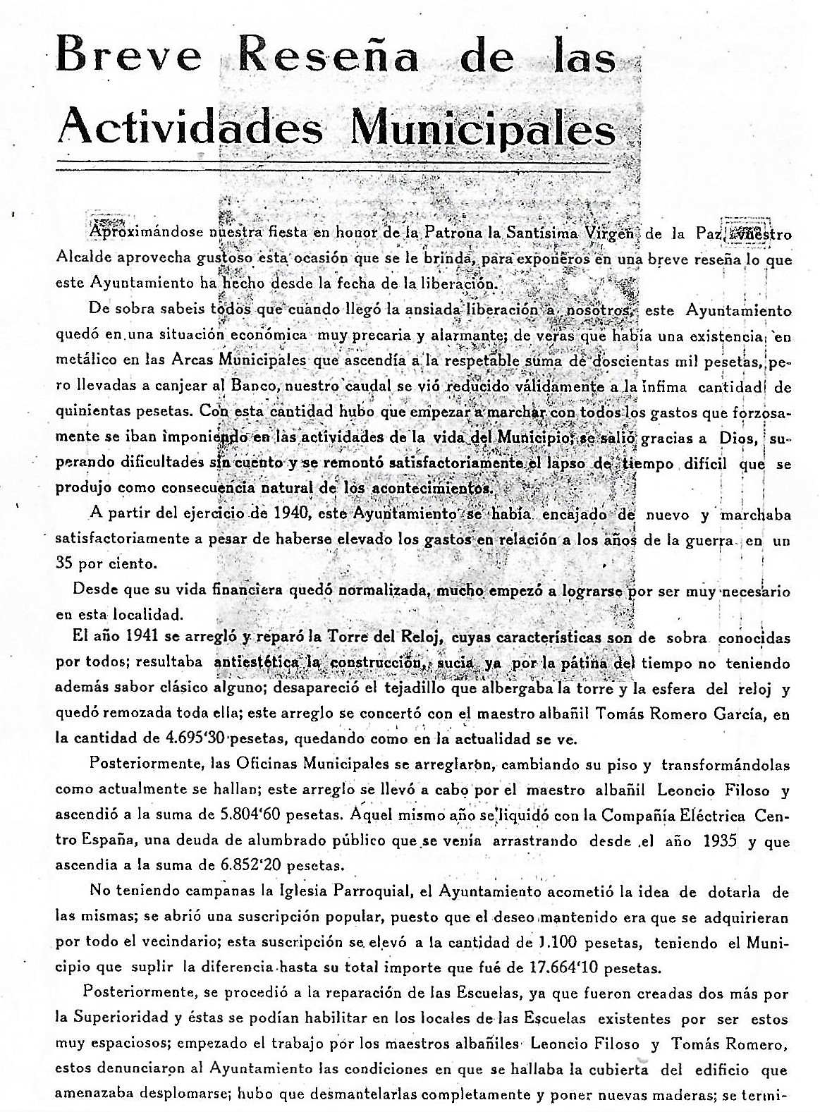 En este año de 1949, a diez años de haber acabado la Guerra Civil, empiezan a decirse o a contar ciertas cosas que hasta entonces no se sabía. El escrito del alcalde, bajo el título de «Breve reseña de las Actividades Municipales» hace varias aclaraciones y una relación muy completa de todas las obras que se había realizado: