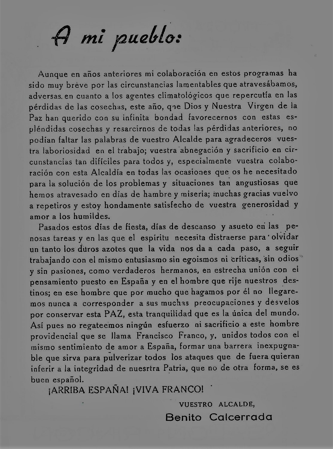 Con fraternal afecto os saluda vuestro ALCALDE. [Fuente: Programa de «Paces» del año 1946. B.Pública Municipal de Villarta de San Juan]