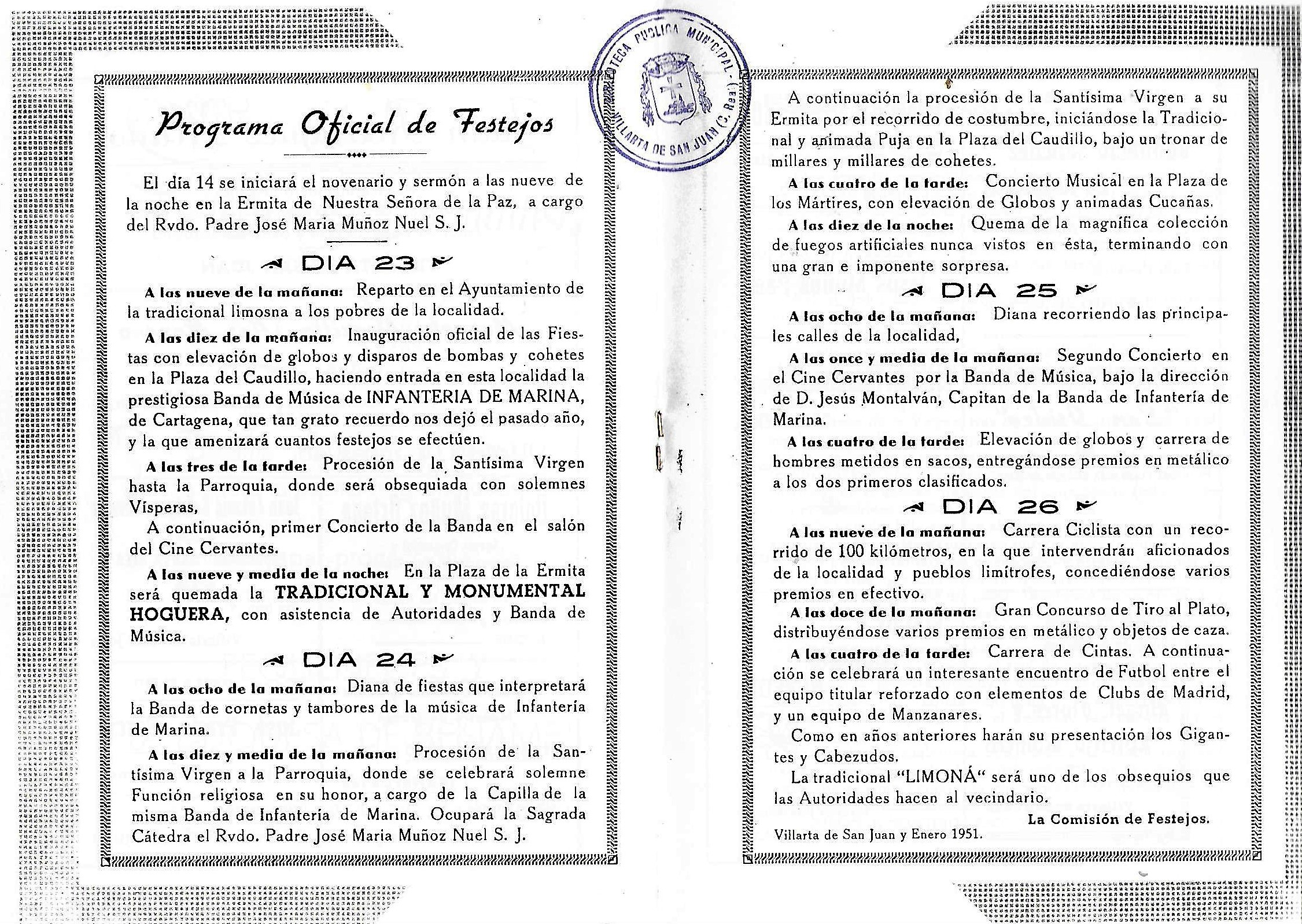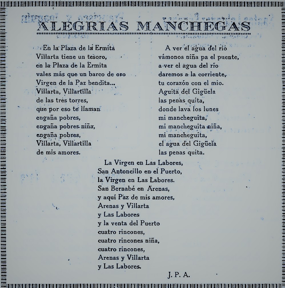 «Nos sorprende nuevamente las fiestas de nuestra excelsa Patrona en el servicio de la Patria empeñados, tarea que nos hemos impuesto desde la juventud, pues no hay que negar que cada eslabón nos hace sentirnos mas añosos; aunque nuestro corazón de villarteros y españoles está cada vez mas henchido de fervor por los principios de nuestro glorioso movimiento; por eso, sólo por eso nos sentimos mas jóvenes todavía. Ya pasaron, a Dios gracias, aquellos años oscuros de la escasez y la penuria en que estuvimos sumidos por causas bien conocidas. Nuestra labor municipal se va desarrollando paulatinamente, quizá con alguna lentitud, pero con firmeza y seguridad hasta alcanzar las ambiciosas metas que nos tenemos impuestas. Pero creemos hacer bien en esto de no «correr la pólvora» de las obras públicas; que tambien se ha de mirar la economía local pricipal fuente de nuestra riqueza, ya que no queremos dejar gravadas con penosas cargas de dificil retorno a las futuras generaciones que forzosamente nos han de suceder. En fin adelante vamos y Dios nos asista siempre. Ya llegan nuestras fiestas y colgados los aperos en la percha del descanso, vamos abriendo los viejos arcones de donde sacaremos nuestras mejores galas del alma y del cuerpo para festejar a la Santísima Virgen nuestra Patrona, teniendo presente que nuestro mejor traje será: La sana alegría, la escrupulosa moralidad en nuestras diversiones, el gran amor a la Virgen de la Paz, la fina hospitalidad y la tradicional hidalguía manchega para con el forastero que viene a visitarnos y el buen deseo de divertirnos sin escándalo. Unas felices fiestas os desea de todo corazón vuestro ALCALDE» [Programa de «Paces» del año 1953. BPM. de Villarta de San Juan]