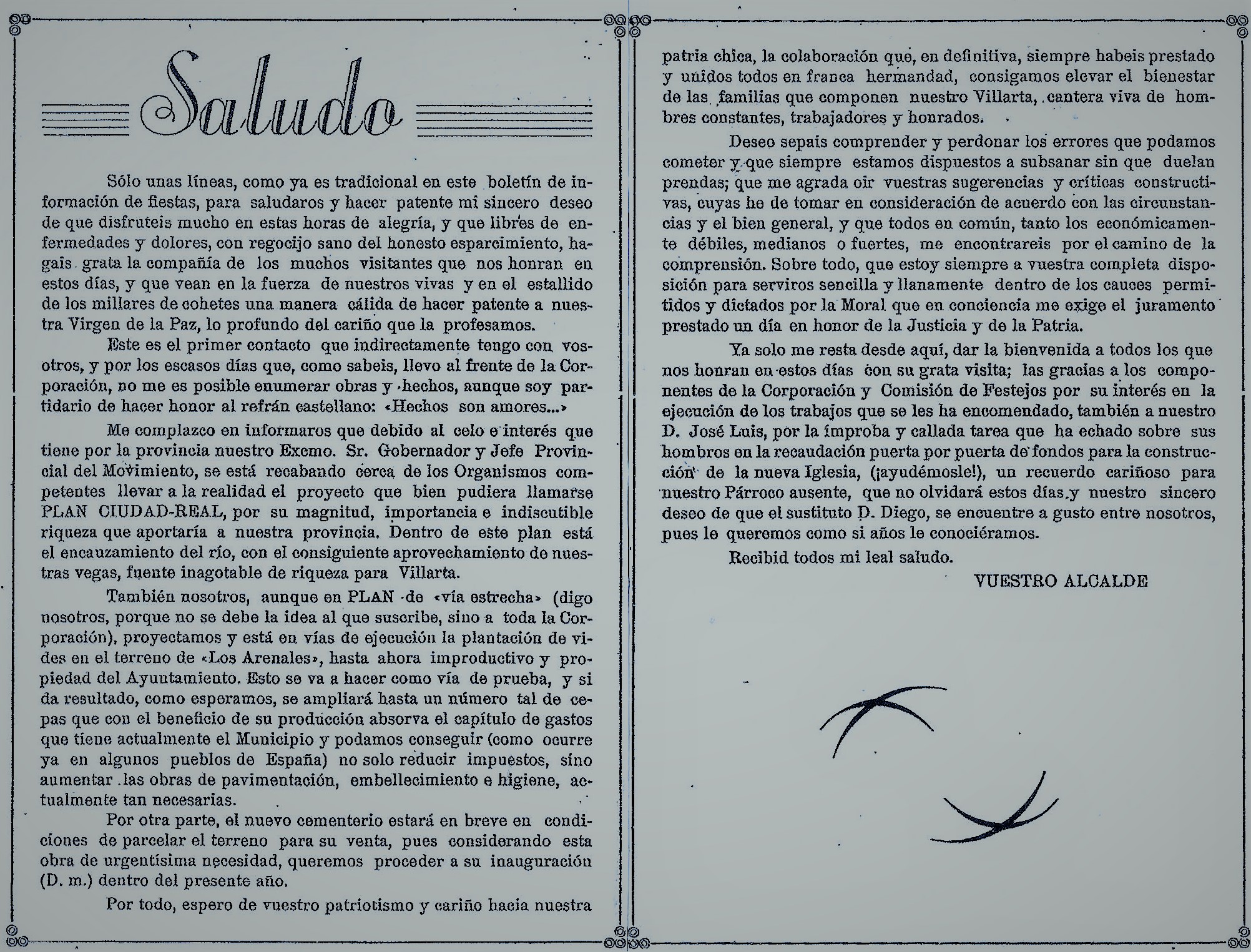 El título del saluda es el de «Unas palabras de nuestro alcalde». El escrito, copiado literalmente dice asi: Villartenses: Tan próximas están las fiestas que, en honor y gloria de nuestra Patrona la Virgen de la Paz, celebramos, que ya casi puede decirse que las estamos viviendo, al ver reflejados en todos vuestros actos y ocupaciones el entusiasmo que, como siempre y cada año, os anima. Con suma satisfacción veo las prisas, que, sin recomendaciones del municipio, como en otros lugares suele acaecer, os dais por blanquear, limpiar y embellecer vuestras fachadas, ya hunildes, ya suntuosas, a tododos por igual os tengo en cuenta y a todos os considero dignos de pertenecer a la laboriosa familia manchega, que es sinónimo de familia honrada, limpia y hacendosa, modelo de nuestra Patria. Se que no es preciso que os recomiende nada, porque todo lo tenéis previsto y no ha de haber forastero de cerca o de lejos, que nos visite estos dias, que se marche con queja de vuestra hospitalidad y liberalidad, pues con ello habéis demostrado siempre ser dignos descendientes de esta tierra hidalga y pródiga, verdadera bendición del Cielo. Tampoco os digo nada del comportamiento religioso para con nuestra Patrona, harto arraigada está en vuestro corazón la devoción a la Stma. Virgen que tantos beneficios nos ha hecho a través de los tiempos y los que de ella esperamos merecer.