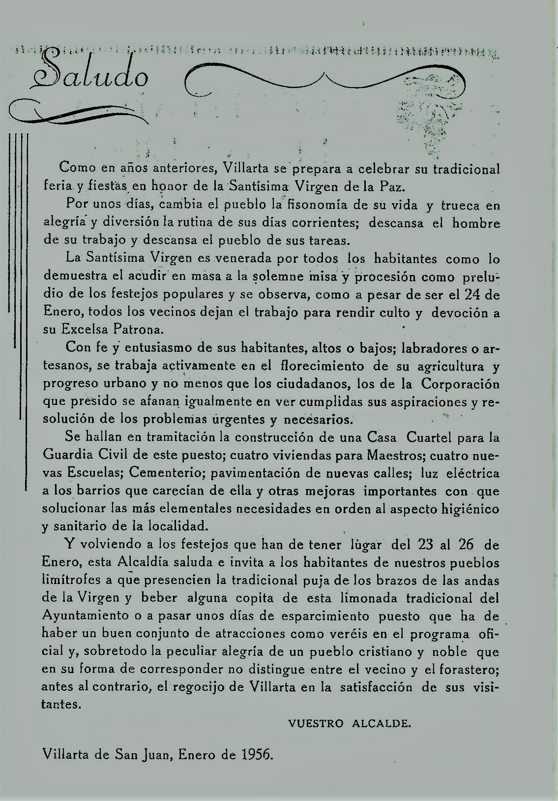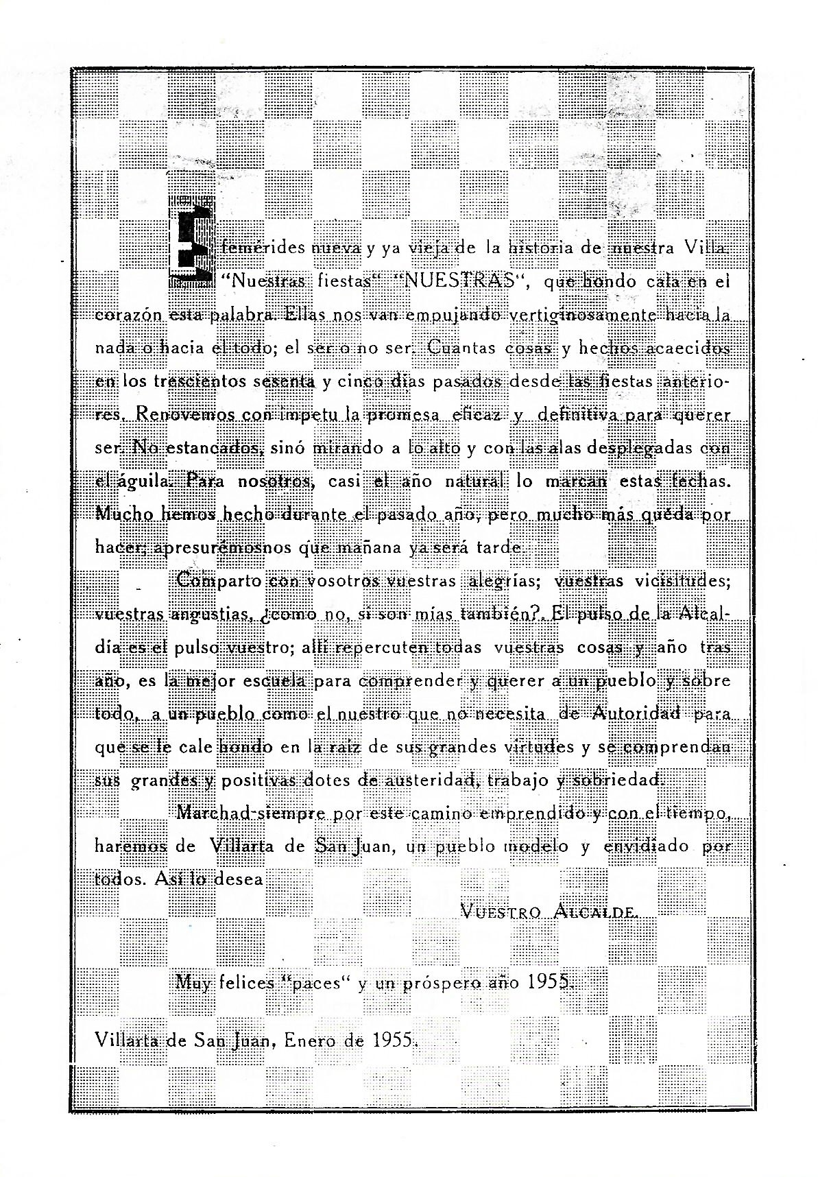 «La llegada de nuestra Fiesta Mayor, que todos los años celebramos para honrar a «Nuestra Sra. de la Paz», nos llena de sana alegría, da ánimos para prodeguir en nuestros quehaceres cotidianos y aliento en el cometido que nos ha sido encomendado. Una de las tareas impuestas y que ha sido acogida con simpatía por los vecinos, es la de que nuestra villa ofrezca cada día mejor aspecto, hacerla mas acogedora, irla dotando de todo aqueloo que es de vital necesidad. La empresa es ambiciosa porque falta mucho por hacer; puede decirse que estamos en el principio, pero este es el propósito de un pueblo, que como el nuestro, tiene miras altas y desea legar a futuras generaciones un genio emprendedor, el que crea felicidad, progreo, orden. Cierto es que en el año que ha finalziado se ha exigido mucho a todos y verda también que respondísteis a nuestra llamada dando solución a cuanto se os ordenó, prestando vuestra colaboración. Las obras realziadas lo dicen bien claro. Con ello la fisonomía de nuestra villa se va transformando. Esto que en un sector se logra después de mucha insistencia, (es posible que por tener mayores aspiraciones) debe surgir espontáneamente de esa manera decidida que vienen colaborando la mayor parte de vecinos, o de ese modo ejemplar de los jóvenes de la Delegación de Juventudes y de Acción Católica, que sacrificando sus ratos de descanso, se entregan por entero a realizar trabajos en el Campo de Deportes; en dar clases nocturnas, o bien ofreciéndose a tomar parte en la reconstrucción de la vivienda de una modestísima familia, que recientemente ha sido derrumbada por las lluvias. Es halagador, no obstante, las mejoras realziadas hasta la fecha y que por ser de todos conocidas no quiero enumerar; hecho posible gracias a los vecinos que con su cariño por nuestra villa nada les ofrece dificultades, por lo que en nombre propio, de la Corporación y Jefatura, os felicito. Que nuestras fiestas llenas de bullicio y colorido, con sus concursos, deportes, espectaculos y tantas atracciones propias del momento, sea a todos muy felices sirviendo de sana expansión; que a cuantos nos visitan en estos días les hagamos grata su estancia entre nosotros y que nuestra «Virgen de la Paz ilumine de fe y amor los corazones de los hombres de nuestra villa. VUESTRO ALCALDE. Villarta de San Juan, Enero de 1959». [ PROGRAMA DE «PACES DEL AÑO 1959. BPM de Villarta de San Juan]