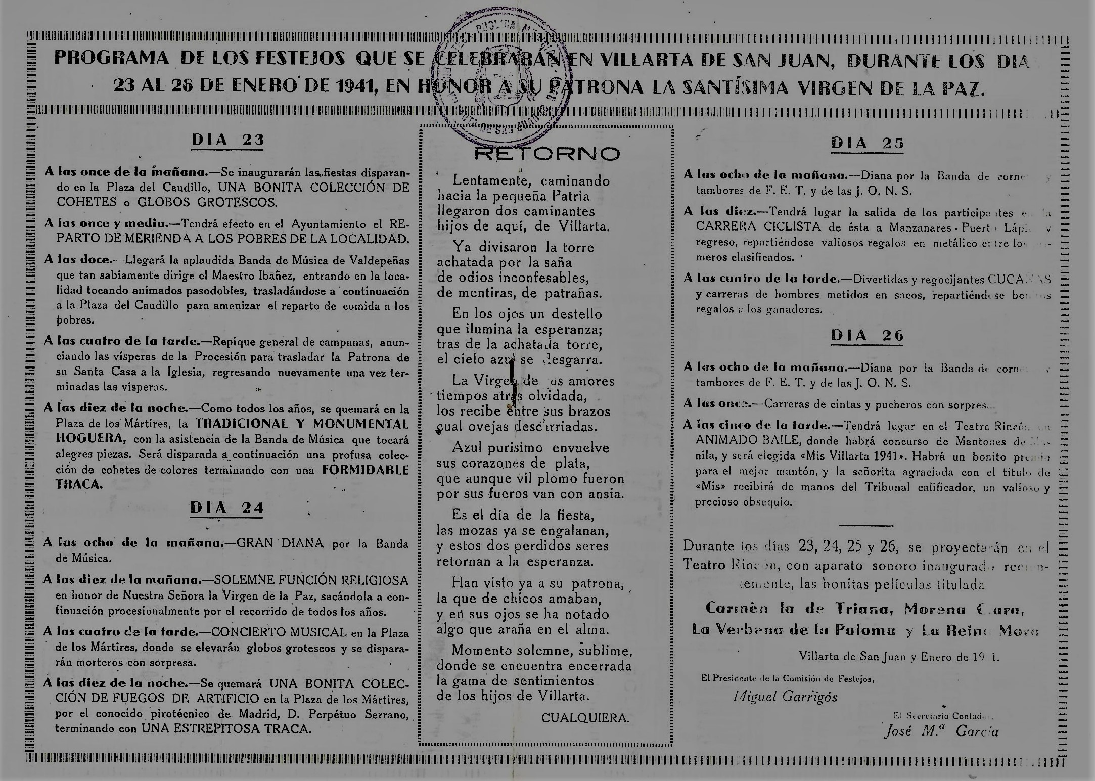 «Un año mas sobre nuestros años; un aldabón llamando constantemente a nuestra vida para que no nos durmamos. Otro año que llegqn nuestras ilusiones y despiertan nuestro imperecedero cariño a nuestra venerada y bendita Patrona. Parecía el año anterior que se hallaban lejanísimas esas fechas y hételas aquí de nuevo. Un soplo; un sueño y … ya estamos de nuevo en fiestas. Creo que todos hemos hecho bastante en el año que se va y hemos sido fiel cumplidores, cada uno en su misión, de los quehaceres que la Divina Providencia nos confía. Hemos trabajado de firme y al final… la meta; esta meta tan querida y prodigada en todos los corazones de Villarta: Veinticuatro de enero de 1952. Pasan los años y cada vez – sin duda los ojos cansados de tanto mirar cosas que no interesan- se vuelven más radiantes a la Madre común. Mucho se la ha ensalzado por plumas prodigiosas pero aunque nuestro canto no sea tan expresivo, sin duda tiene tiene sus encantos dentro de la sobriedad con que se los prodigamos. Más, mucho más, debía escribirse de Tí; consuelo del afligido, esperanza del labrador; enfermera del incurable; seguro puerto del náufrago en la vida…. cuantos y cuantos adjetivos pero ¿donde se halla aquel que compendie y concrete exactamente tu grtandeza? Nosotros, pobres mortales, te alabamos, pero… que pobres en nuestras expresiones y cuan poco alcanzan la perfección de alma que nos exiges. Desde mi puesto de primera Autoridad Local, veo tus hijos que se afanan por perfeccionarse cada año mas y su amor por Tí, va tomando caracteres menos diguminados. Que perseveren y asi sea en beneficio de todos. VUESTRO ALCALDE. [Programa de «Paces» del año 1952. Fuente: BPM de Villarta de San Juan]