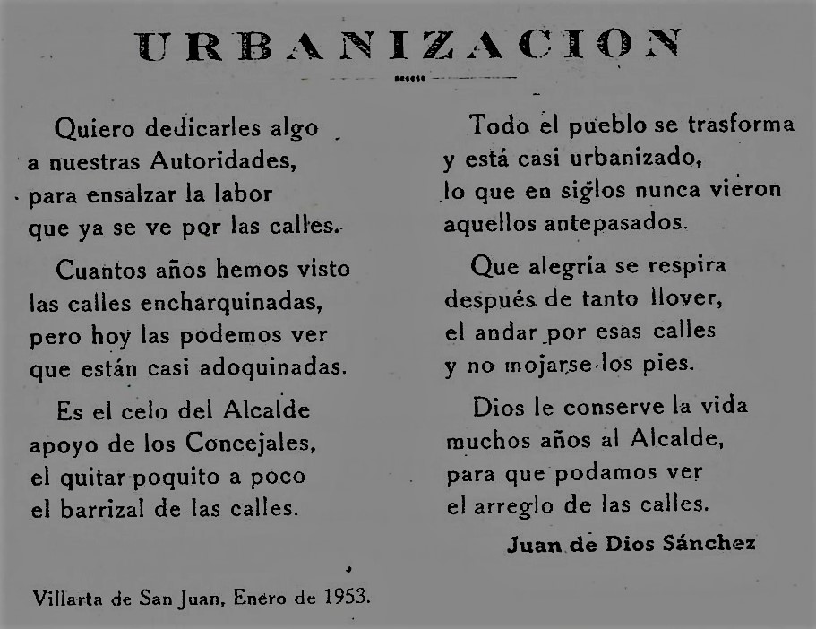 Por estas fechas se habría empezado un proyecto de empedrar las principales calles de la localidad y Juan de Dios Sánchez insertó un pequeño poema dando noticias del mismo y dándole gracias al alcalde: