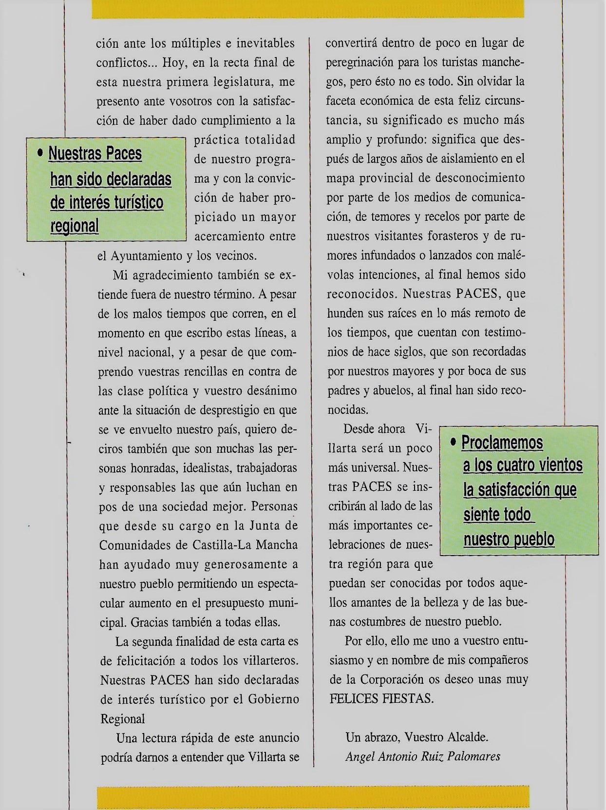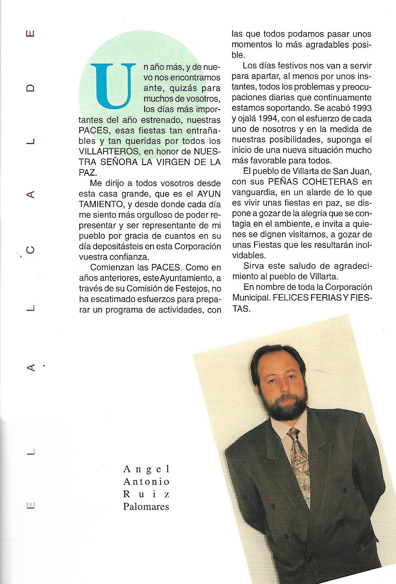 Programa de «Paces» del año 1994. Saluda del Alcalde. ( Fuente: Programas de festejos. Colección particular)