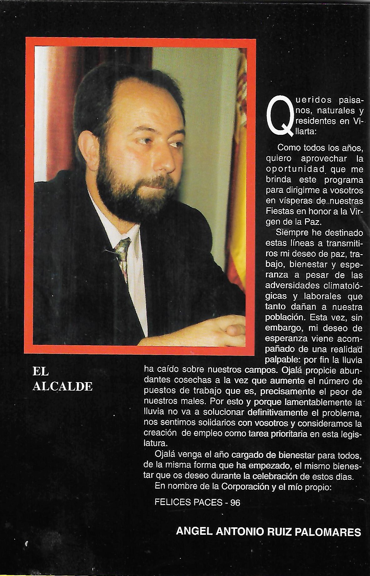Programa de «Paces» del año 1995. Saluda del Alcalde. ( Fuente: Programas de festejos. Colección particular)