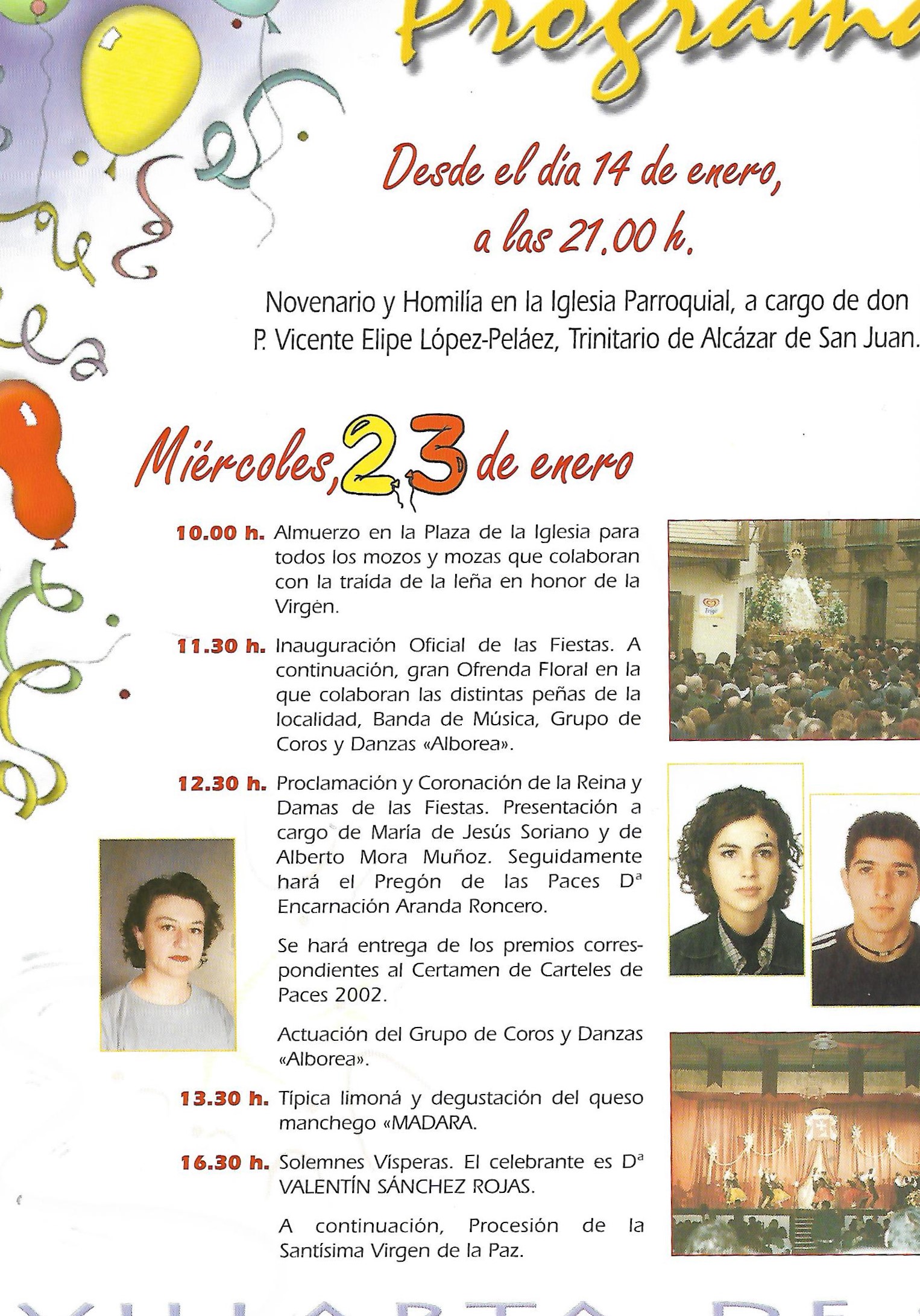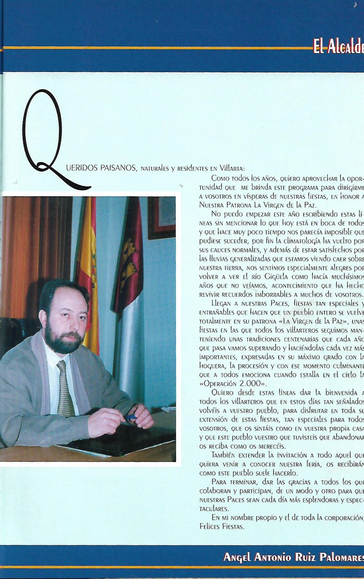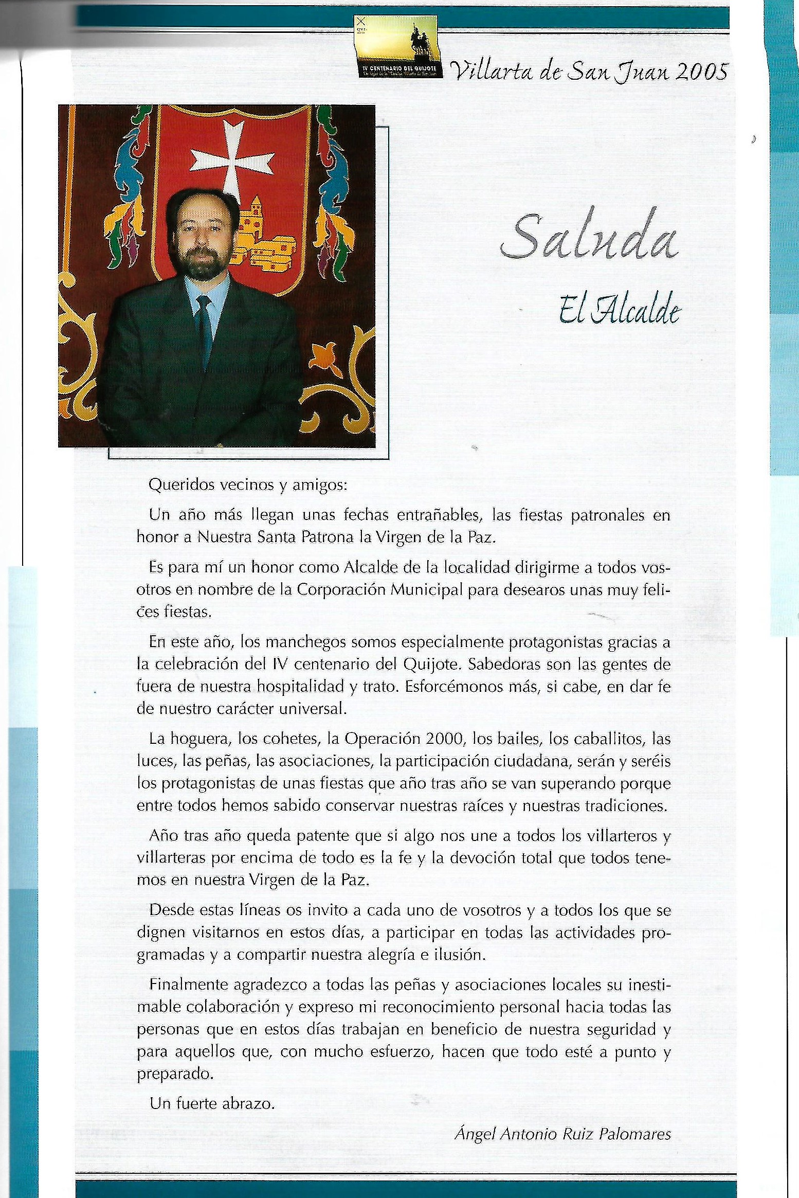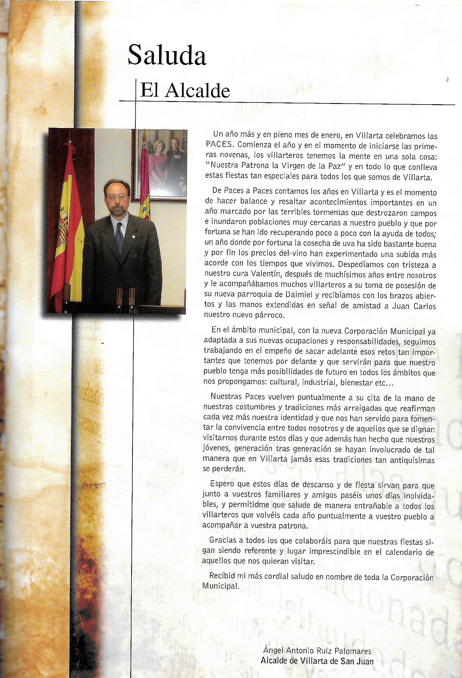 Se abre el programa con una foto de los reyes Juan Calos y Sofia que aparecerá durante los dos años siguientes, hasta que por problemas de protocolo, dejó de incorporarse. Ademas de esta foto comienza a publicarse los saludas de las autoridades autonómicas y provinciales: Presidente de Castilla-La Mancha ( José Bono), Gobernador Civil (Tomas Morcillo Cuenca) y Presidente de la Diputación Provincial (Francisco Ureña Prieto), terminando el saluda primordial de nuestro alcalde (Angel Antonio Ruiz Palomares.