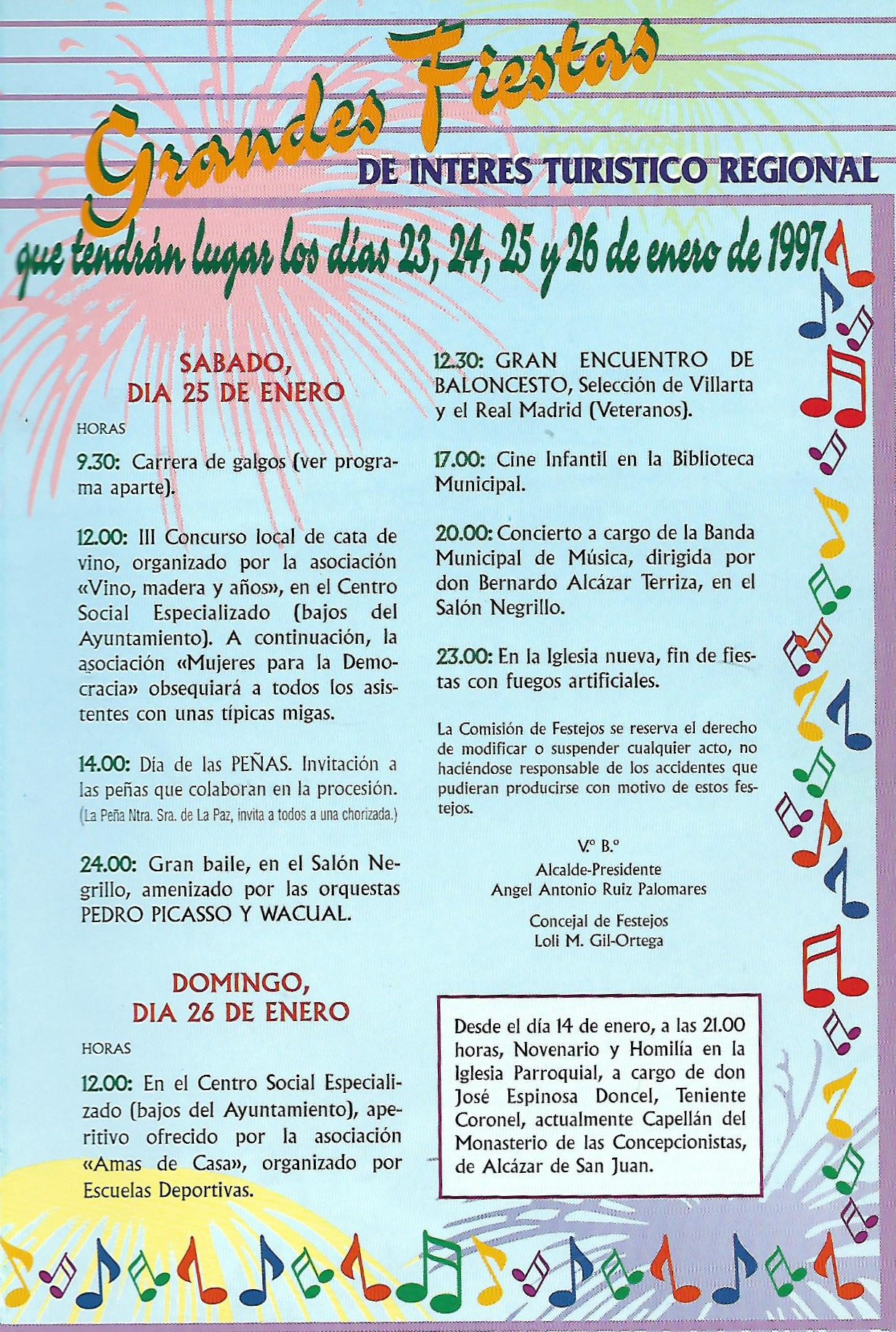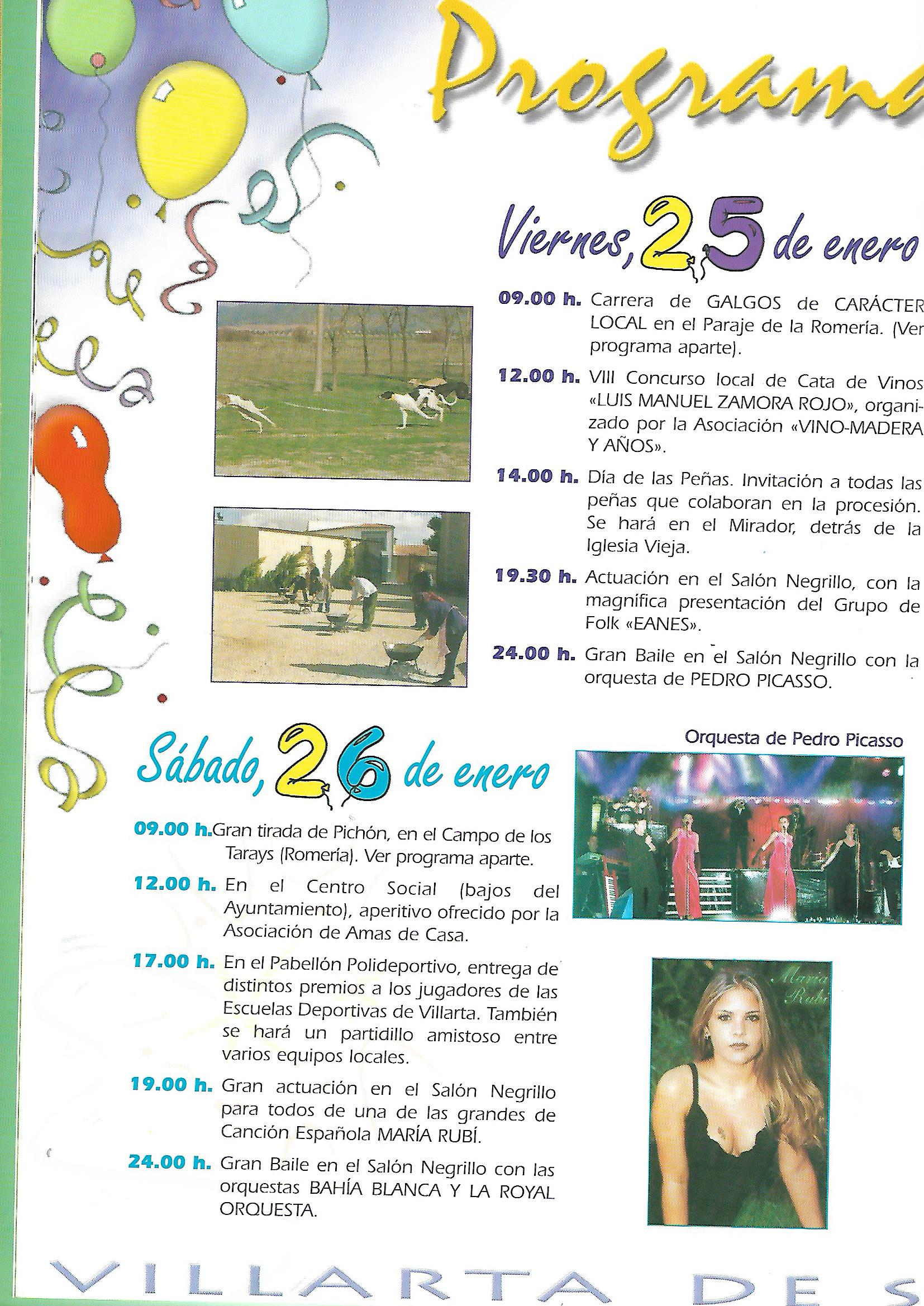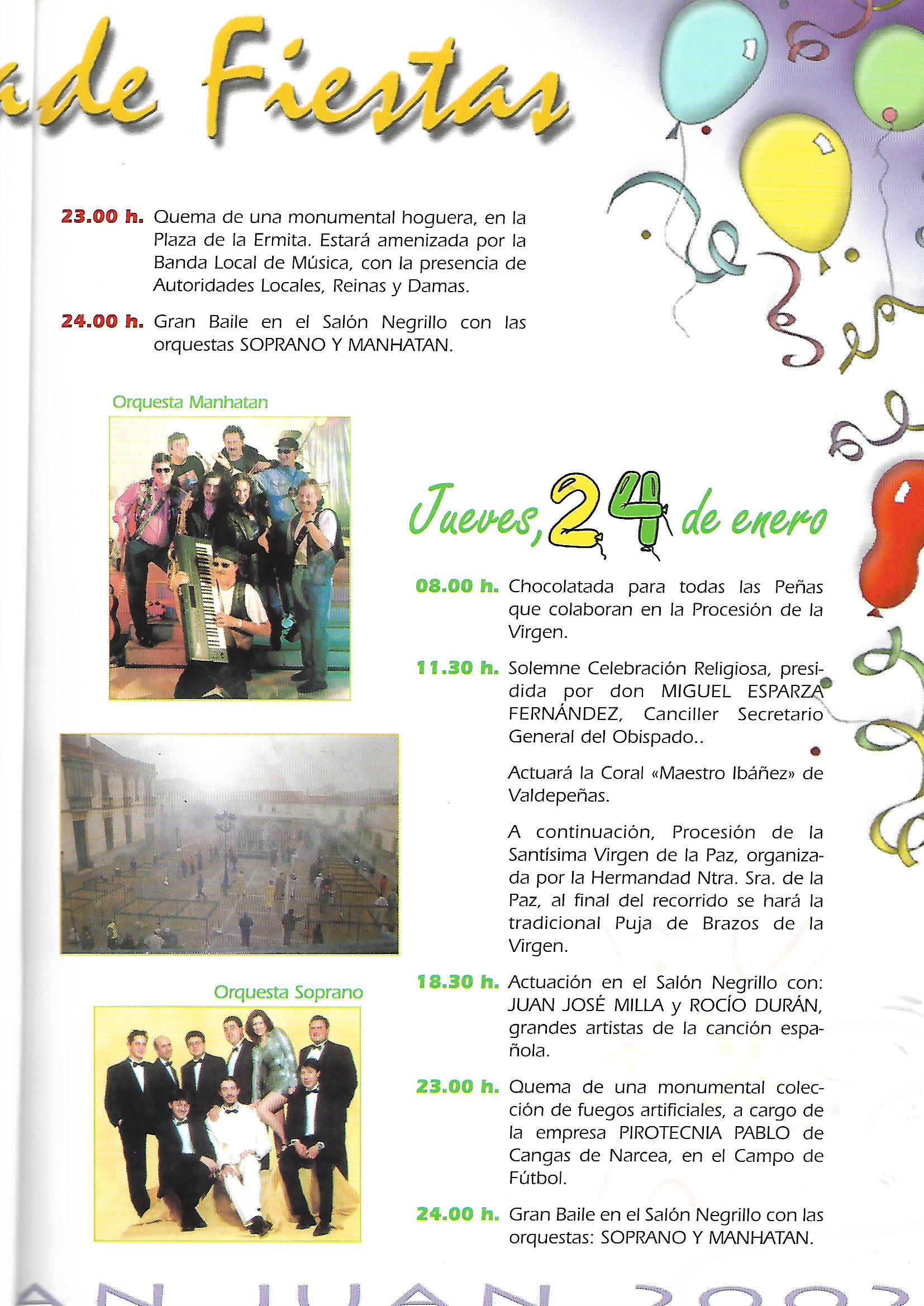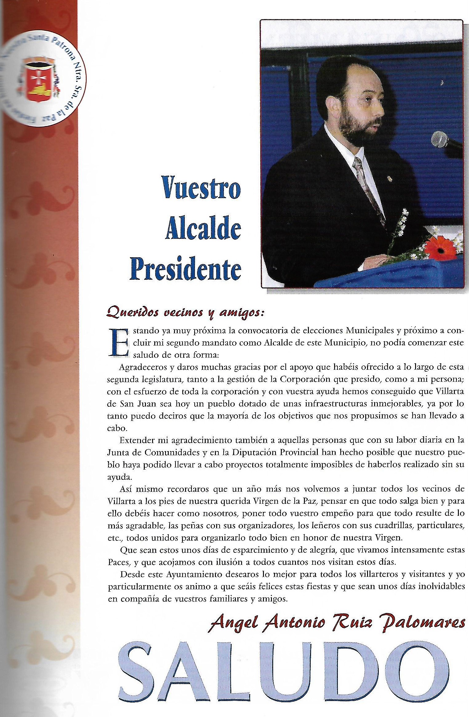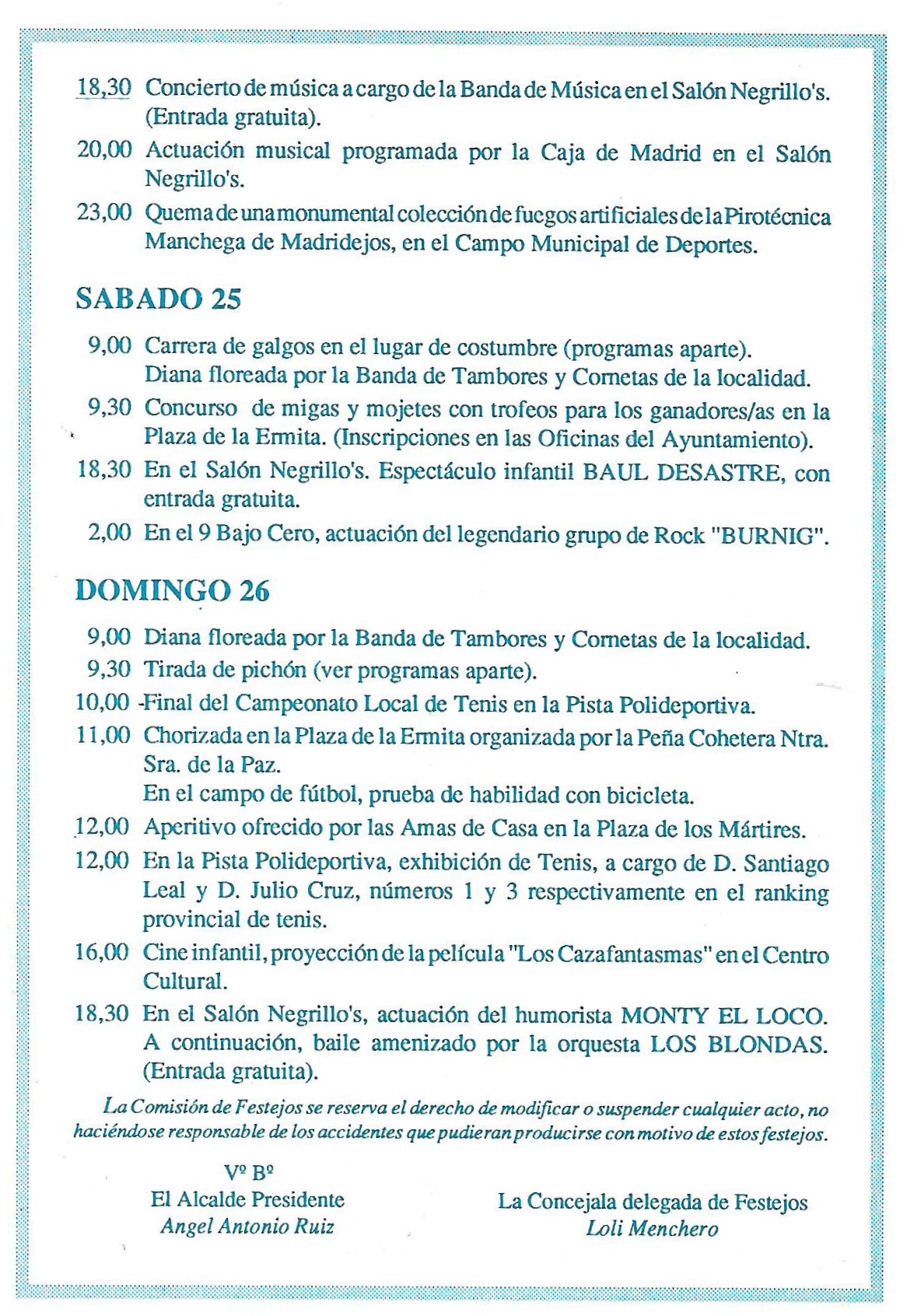 Se abre el programa con una foto de los reyes Juan Calos y Sofia que aparecerá durante los dos años siguientes, hasta que por problemas de protocolo, dejó de incorporarse. Ademas de esta foto comienza a publicarse los saludas de las autoridades autonómicas y provinciales: Presidente de Castilla-La Mancha ( José Bono), Gobernador Civil (Tomas Morcillo Cuenca) y Presidente de la Diputación Provincial (Francisco Ureña Prieto), terminando el saluda primordial de nuestro alcalde (Angel Antonio Ruiz Palomares.