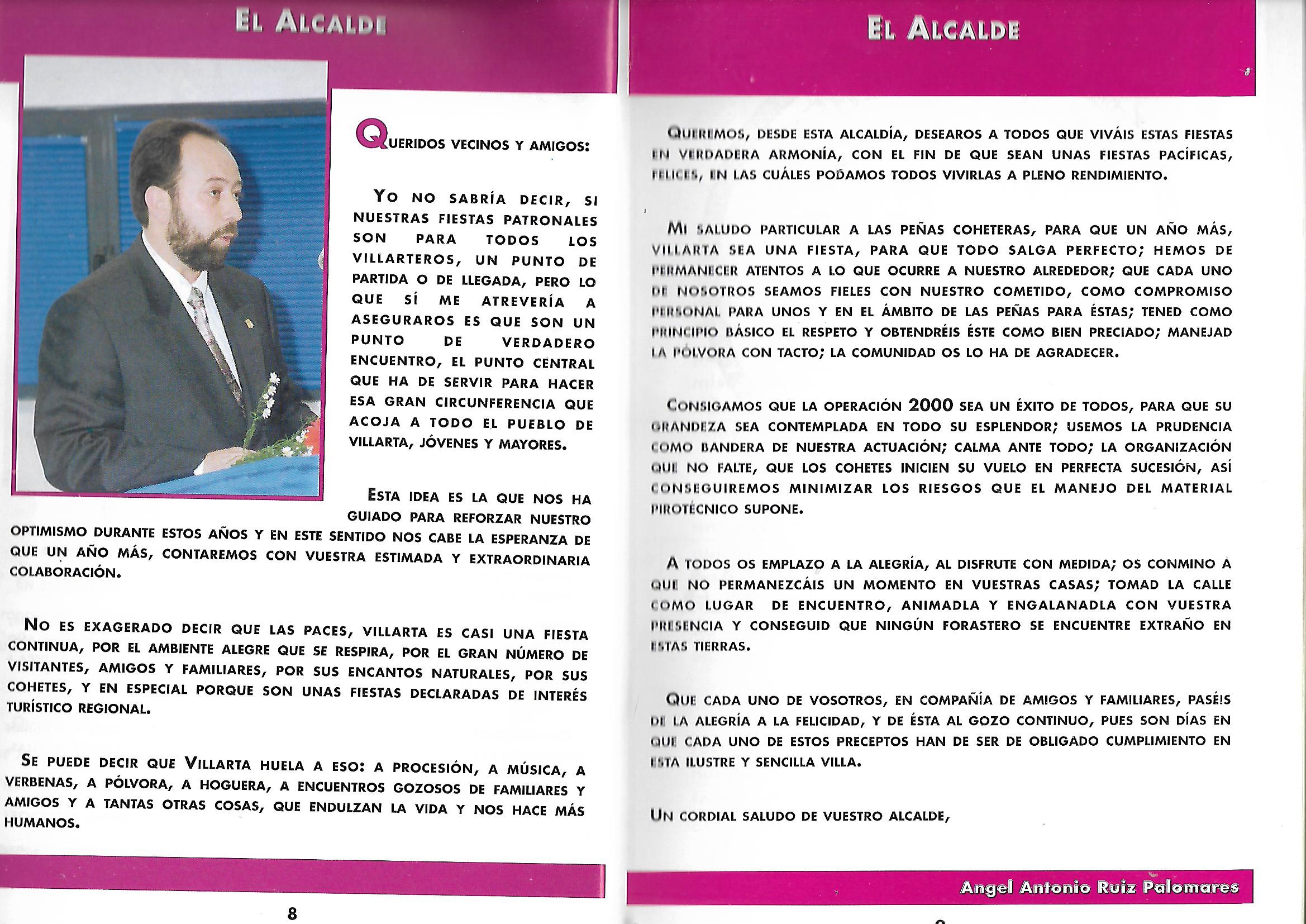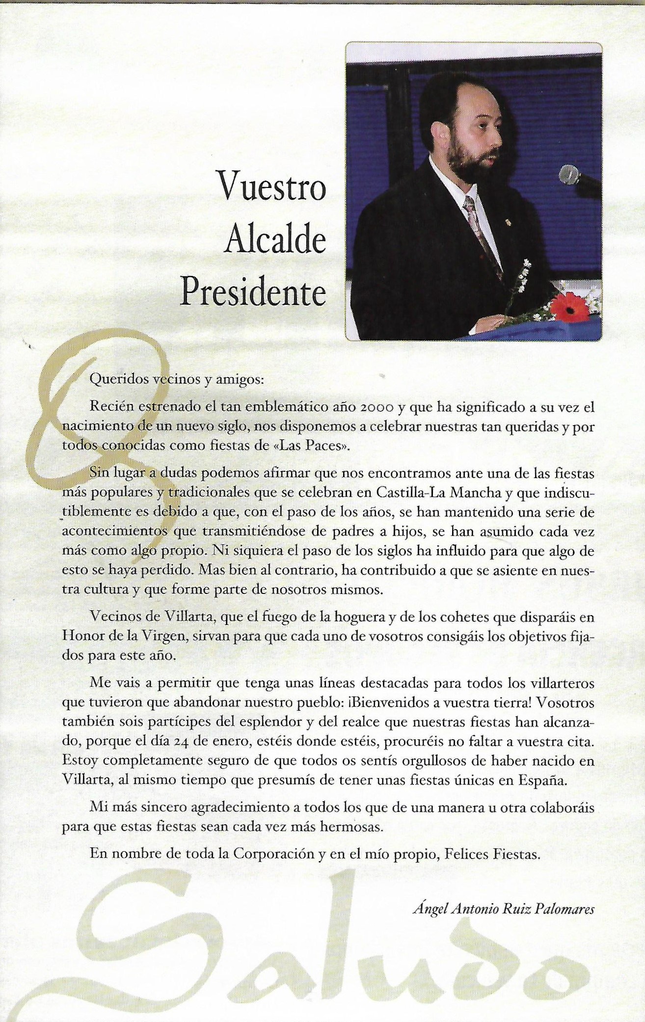 Programa de «Paces» del año 2000. Saludo del Alcalde (Fuente: Programas de festejos. Colección Particular )