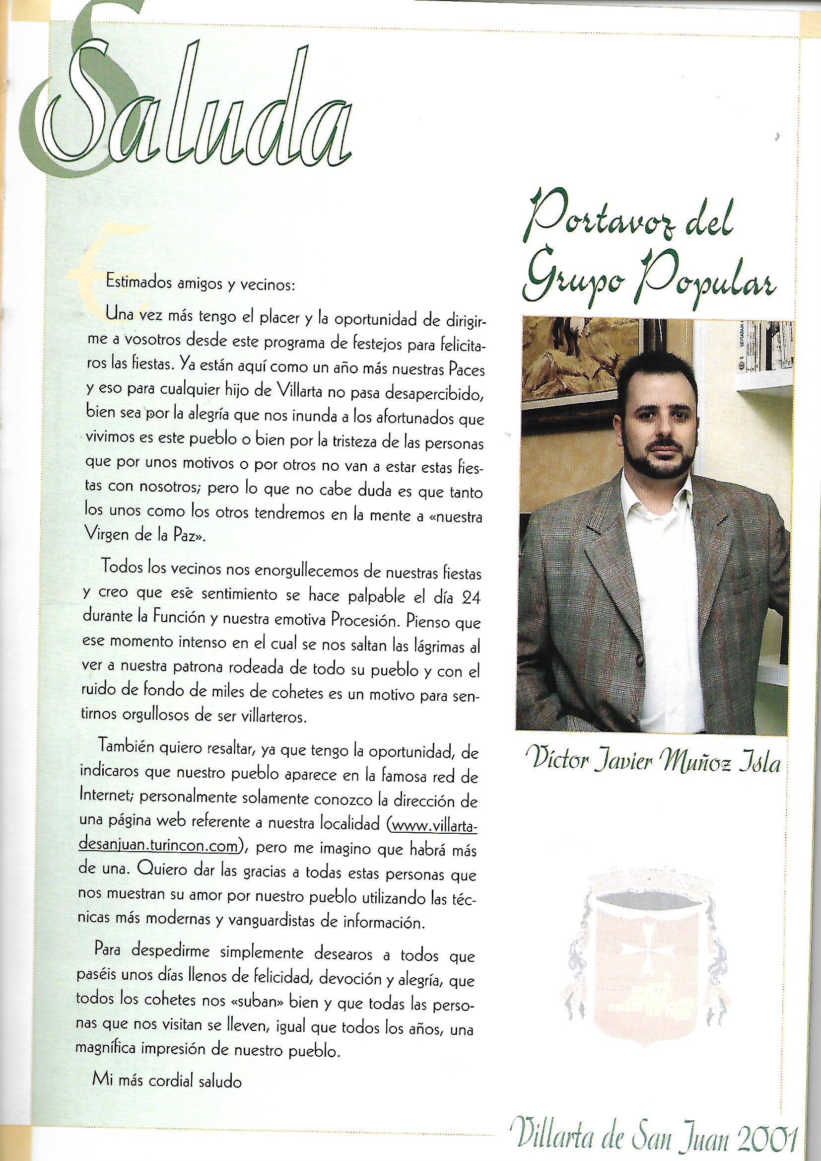 Programa de «Paces» del año 2001. Portavoz del Grupo Popular. (Fuente: Programas de festejos. Colección particular)