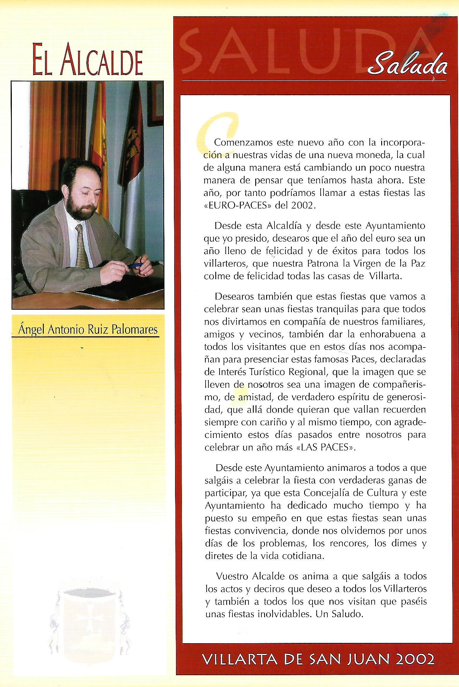 Programa de «Paces» del año 2002. Saluda del Alcalde. ( Fuente:Programas de festejos. Colección particular)