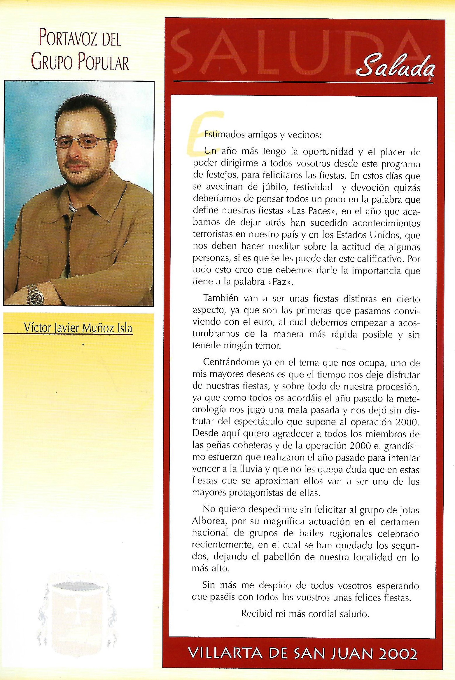 Programa de «Paces» del año 2002. Saluda del Portavoz del Partido Popular (Programa de festejos. Colección particular)