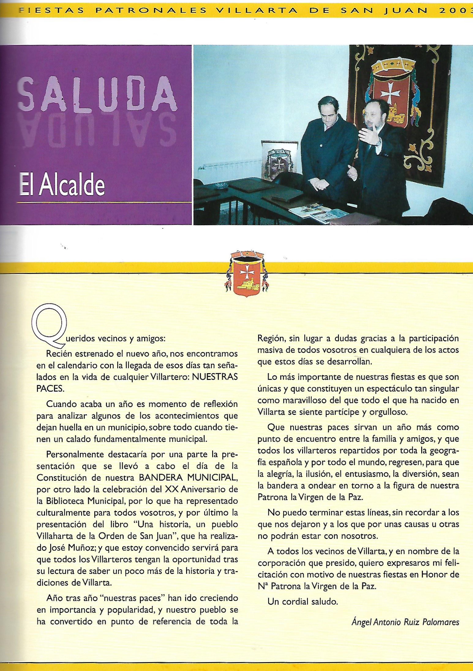 Programa de «Paces» del año 2003. Saluda del Alcalde (Fuente: Programas de festejos. Colección personal)
