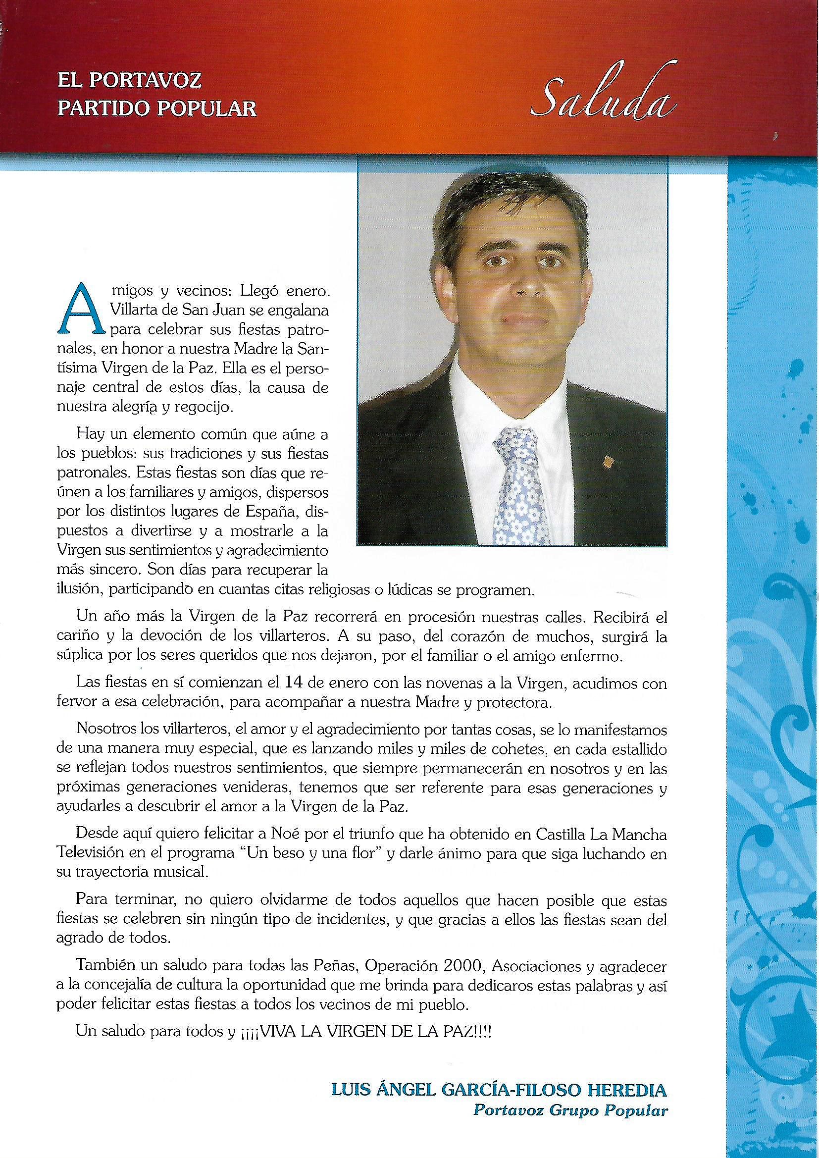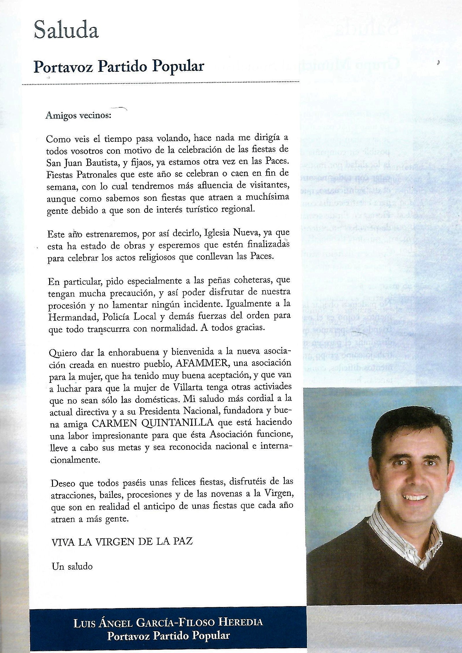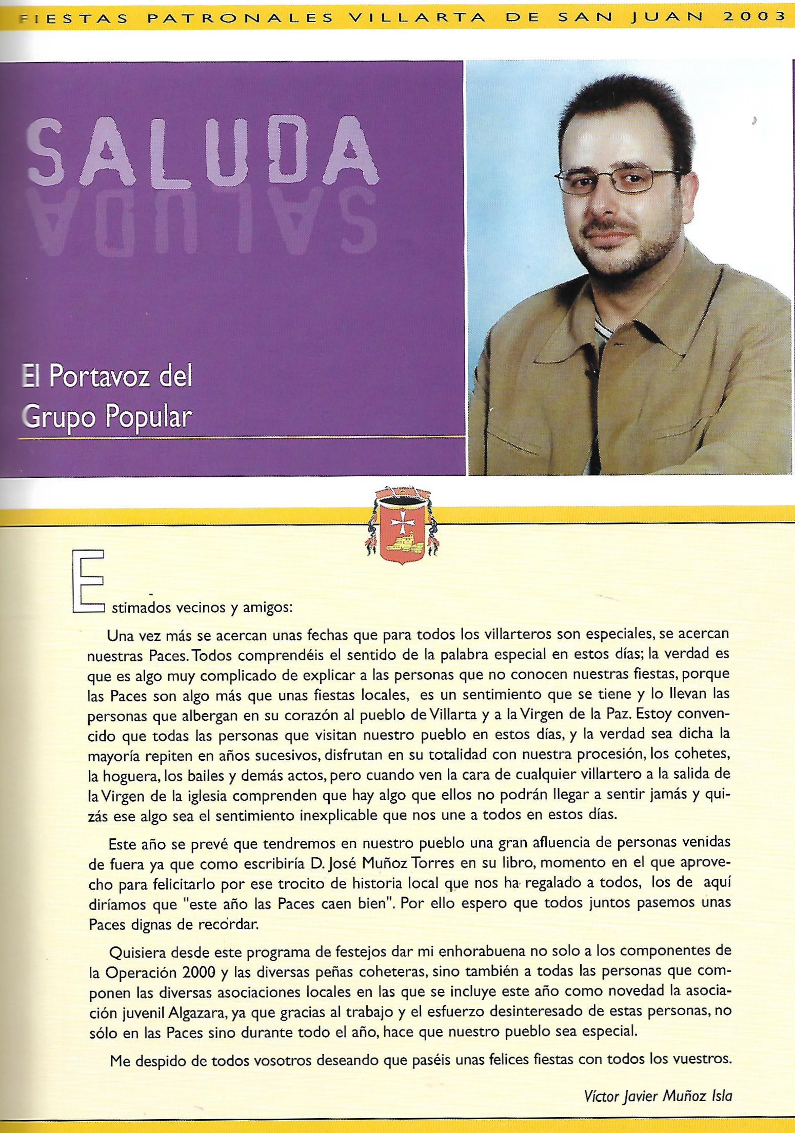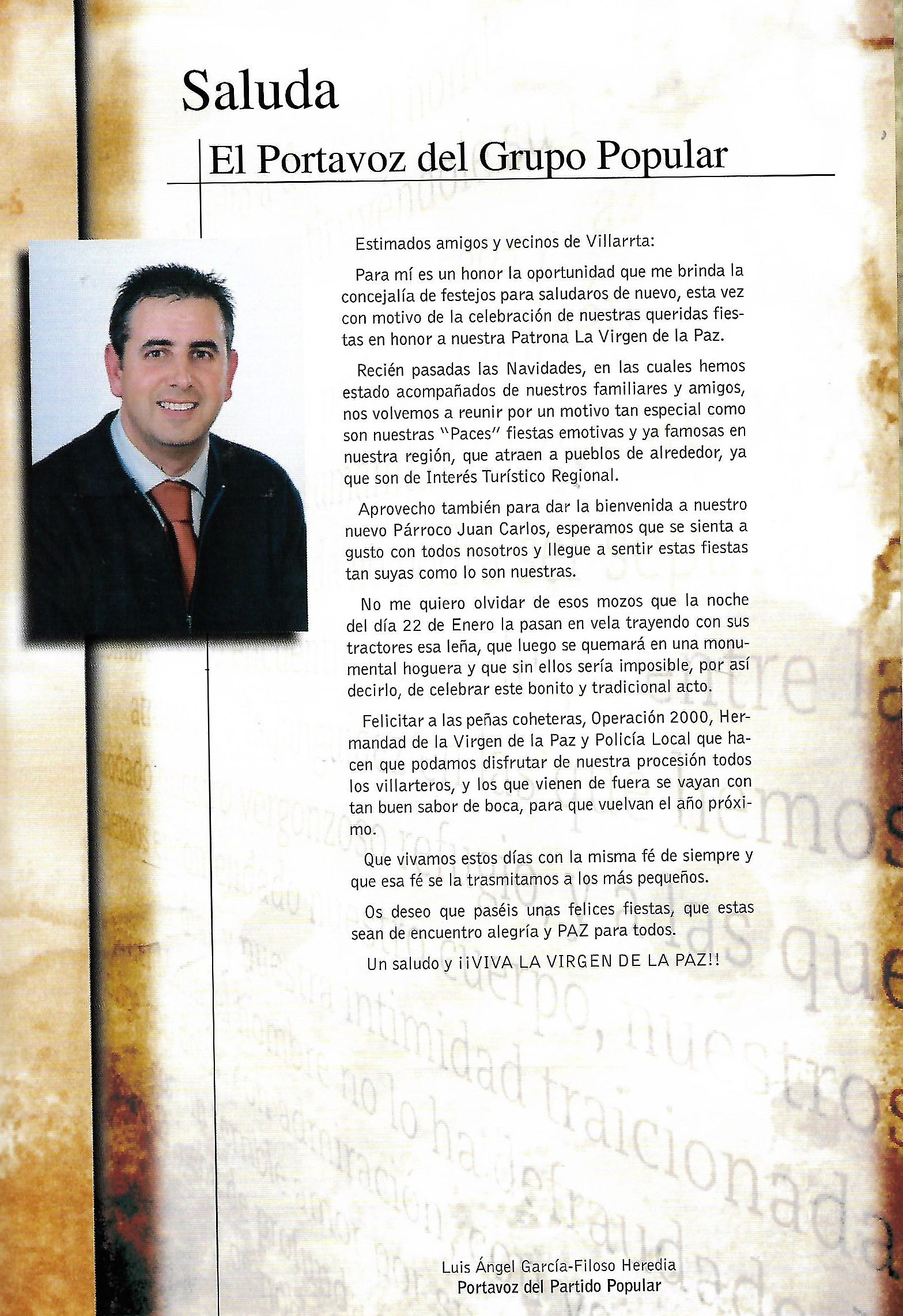 Programa de «Paces» del año 2003. Saluda del Portavoz del Grupo Popular (Fuente: Programas de Festejos. Colección personal)