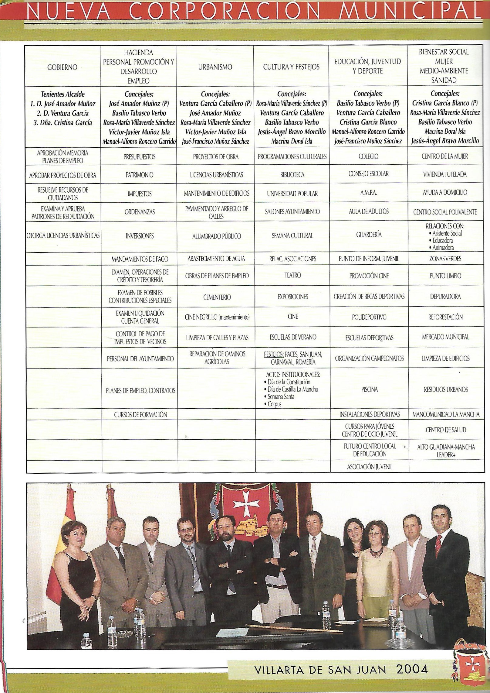 Programa de » Paces» del año 2004. Nueva Corporación: (De izqda. a dcha.) Macrina Doral Isla(PP), José Francisco Muñoz Sánchez (PP), Manuel Alfonso Roncero Garrido(PP), Victor Javier Muñoz Isla ( Portavoz del PP), Angel Antonio Ruiz Palomares (Alcalde. PSOE), José Amador Muñoz (PSOE), Ventura García Caballero ( PSOE), Cristina García Blanco (PSOE), Rosa María Villaverde Sánchez(PSOE), Basilio Tabasco Verbo (PSOE) y Jesús Angel Barvo Morcillo (PP) (Fuente: Programa de festejos. Colección particular)