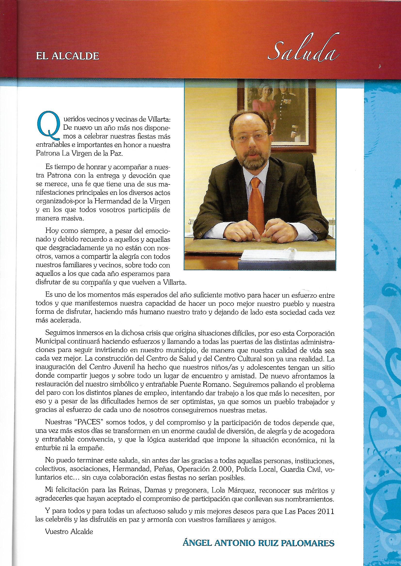 Programa de «Paces» del año 2011 Saluda del Alcalde ( Fuente: Programas de festejos.Colección Particular)