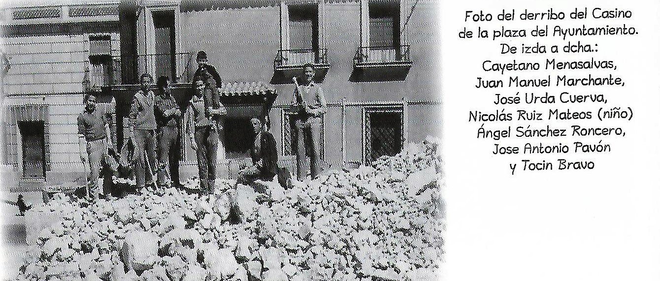 Pocas ocasiones hemos tenido de contar con documentos gráficos donde quede retratada parte de nuestra historia. La fotografía que se insertó en el programa de «Paces» del año 2012 se corresponde con el edificio mas antiguo, aunque modificado en varias ocasiones, de Villarta, o casi, y tan solo superaría su antigüedad la iglesia de Santa María. Siendo Villarta una pequeña aldea, siglo XVI, en este lugar se encontraba el edificio del Pósito, lugar en el que se guardaban los diezmos de impuestos ( grano de trigo y cebada), asi se mantuvo durante muchos años cerrando la plaza pública por el levante. Posteriormente fue lugar para las escuelas, ayuntamiento ( cuando a principios de siglo XX, se incendió el ayuntamiento) y posteriormente vendido por el ayuntamiento, siendo alcalde Exuperio Muñoz, se convirtió en comercio de tejido al que en el año 1934, aproximadamente, se le hizo una planta superior, donde posteriormente estaría el casino, que fue emblemático con sus soportales donde buscaban refugio las «ciriacas» y otros, vendiendo chucherias (bueno chucherias es mucho decir: un patacón de pipas o garbanzos,..) los domingos y donde se exponían las carteleras de las películas que se proyectaban en los cines de Dolores y de Adolfito. Asi terminan muchas veces páginas de la historia… Enfrente cruzando la carretera la vistosa fachada ( antes de ser sede de una entidad bancaria) de la casa de Don Gerardo Gómez-Calcerrada. [ Por cierto, no hace tanto, siendo alcalde Cayetano, se derribó el edificio del cuartel y ayuntamiento para hacer una edifico nuevo. Con este motivo la torre del reloj quedó sola, -sin su compañero de siempre que diría Alfonso Rincón-, y me pregunto ¿No tiene alguien alguna foto de cuando con este motivo solo quedó la torre del reloj?]