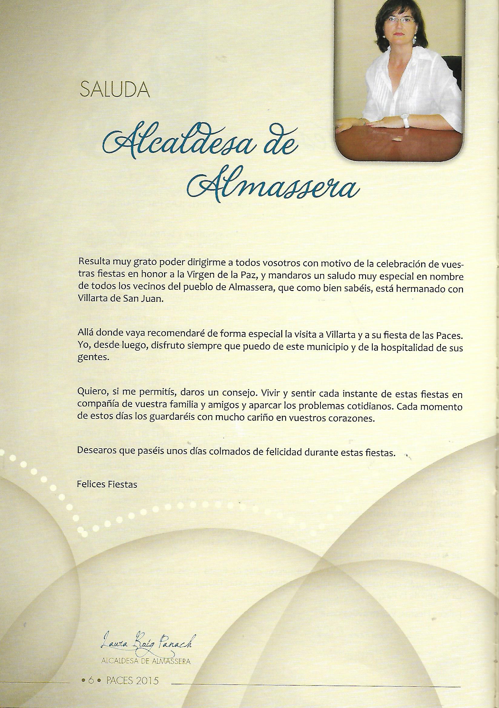 Programa de «Paces» del año 2015. Saluda de la Alcaldesa de Almassera. (Fuente: Programas de festejos. Colección Particular)