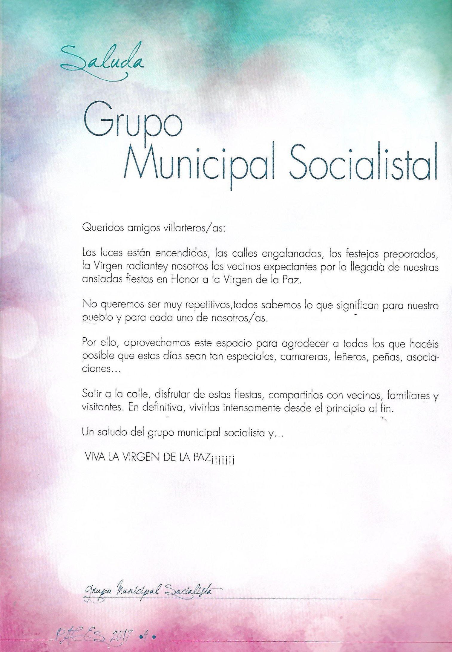 Programa de «Paces» del año 2017. Saluda del Crupo Municipal Socialista (Fuente: Programas de festejos. Colección particular)