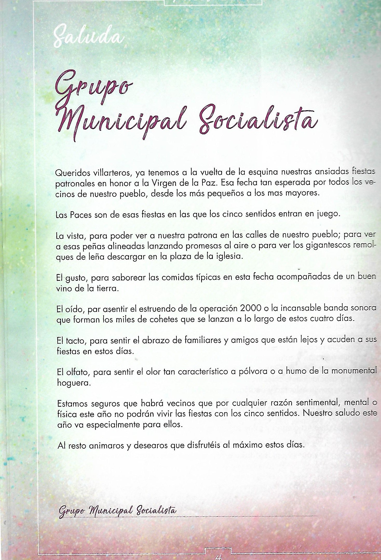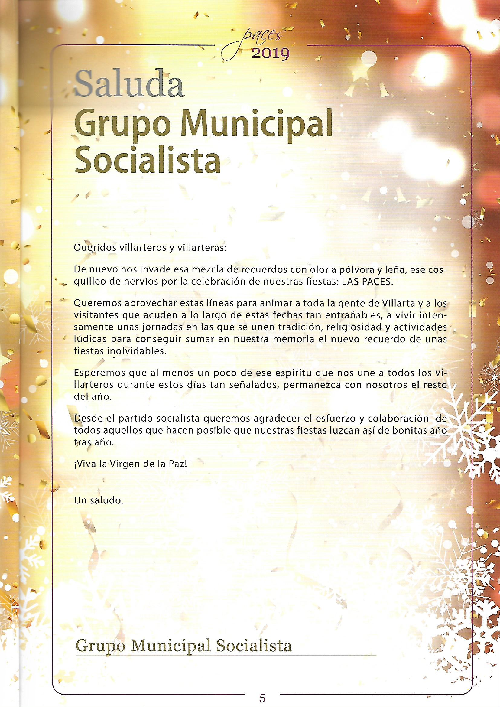 Programa de «Paces» del año 2019. Saluda del Grupo Municipal Socialista ( Fuente: Programas de festejos. Colección particular