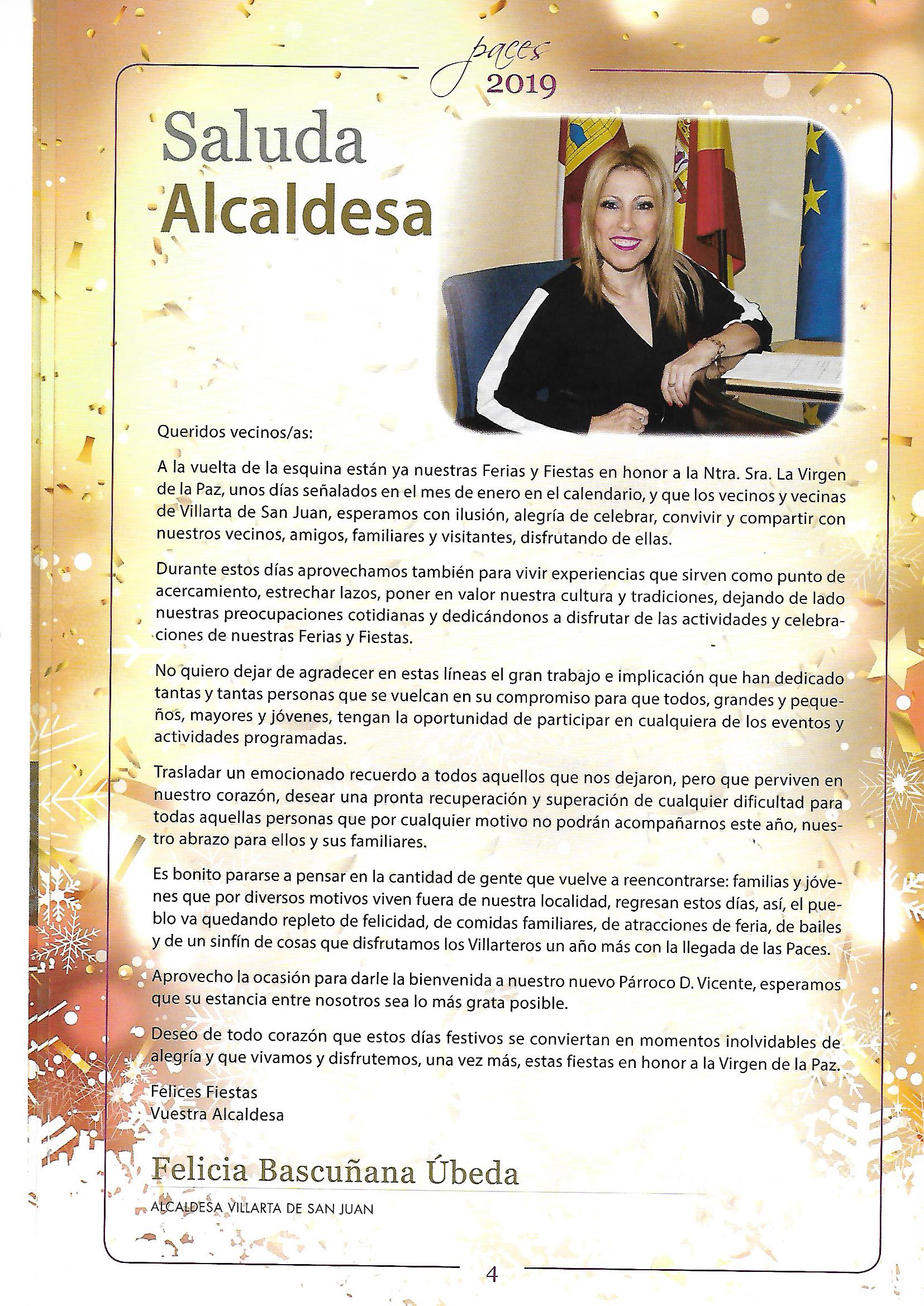 Programa de «Paces» del año 2019. Saludo de la Sra. Alcaldesa (Fuente: Programas de festejos. Colección particular)