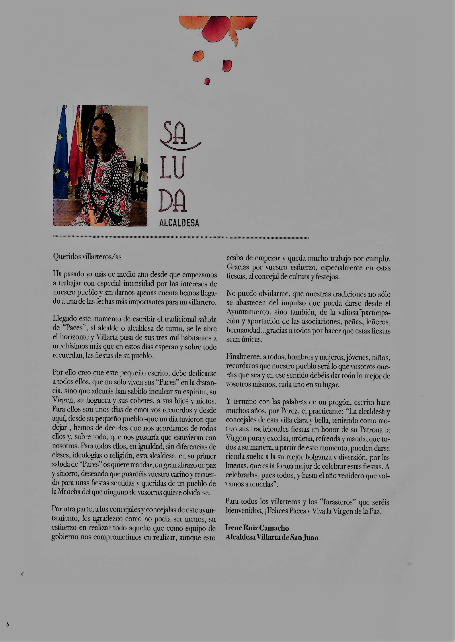 Programa de «Paces» del año 2016. Saluda de la Sra. Alcaldesa (Fuente: Programas de festejos. Colección particular)