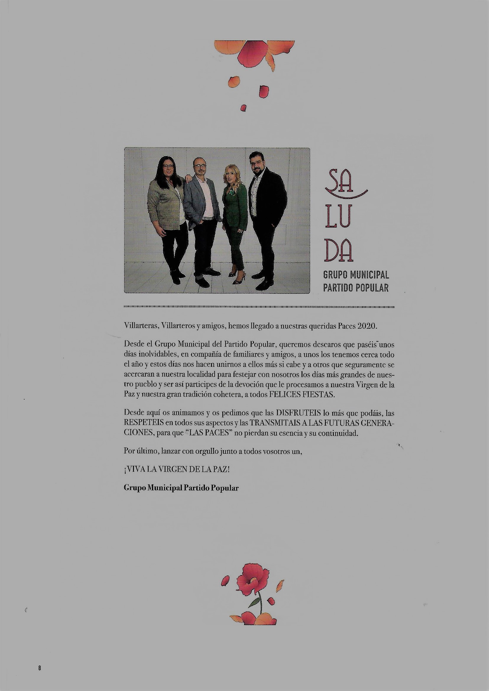 Programa de » Paces» del año 2020. Salauda del Grupo Municipal Popular ( Fuente: Programas de festejos. Colección particular)