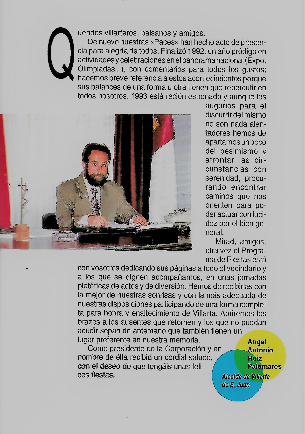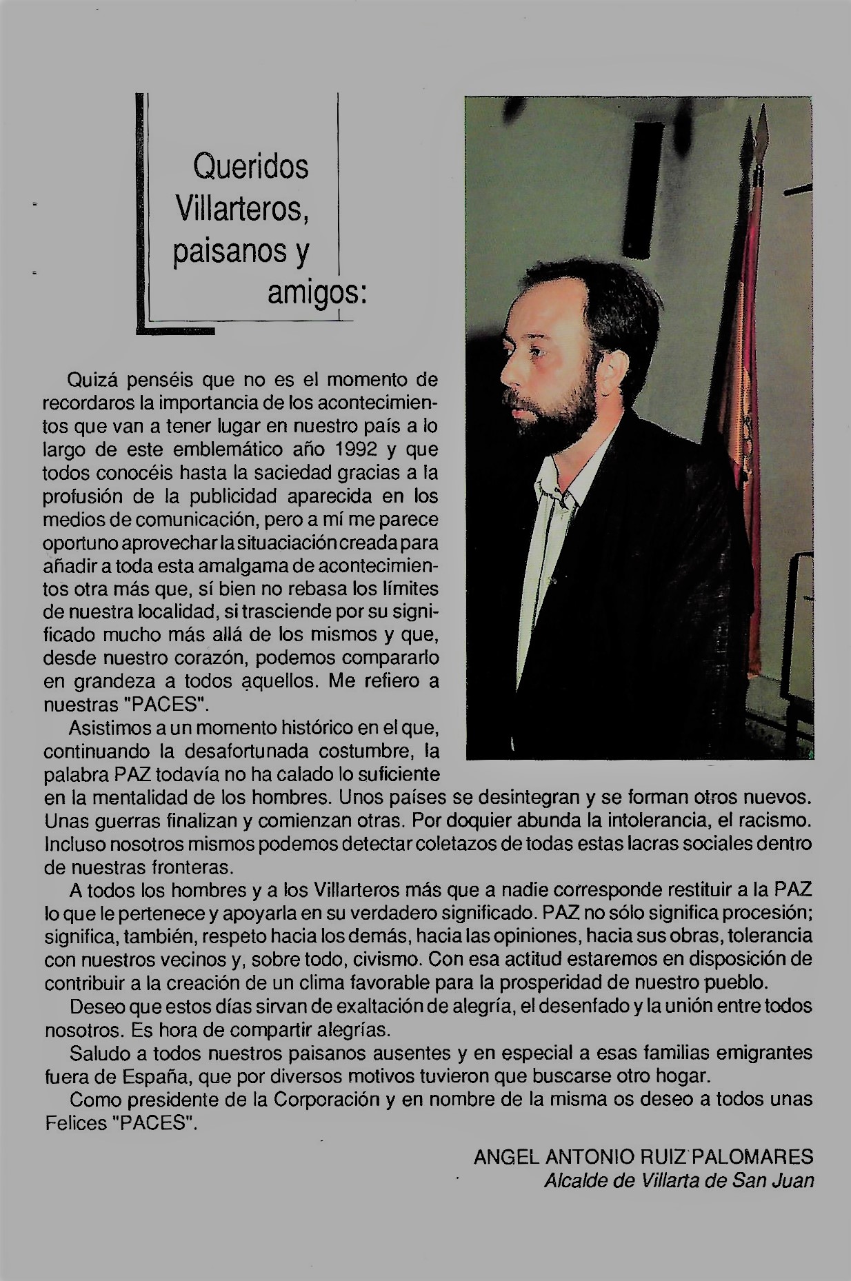 Programa de «Paces» del año 1993. Saluda del Alcalde ( Programa de festejos. Colección Particular)