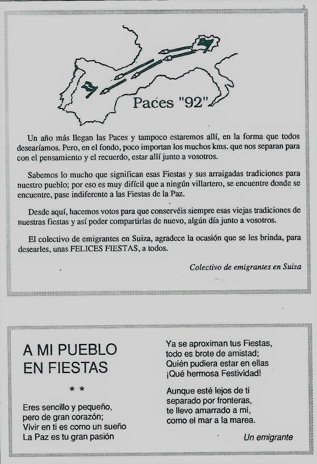 Por mucho que se quiera escribir un resumen de las «Paces» aunque sea a partir de los programas, será imposible y quedarán muchas cosas sin decir pero algunas veces, en la lectura de los programas, encontramos notas, datos o noticias que llaman la atención y que son dignas de incluir en este resumen. El hecho es que entre las poesias del programa de «Paces» del año 1992 hemos encontrado un dato que merece la pena resaltar firmado por «Colectivo de emigrantes en Suiza».
