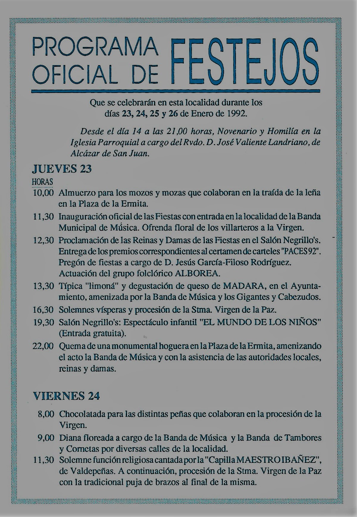 Programa de «Paces» del año 1992 (Fuente: Programa de festejos. Colección Particular)