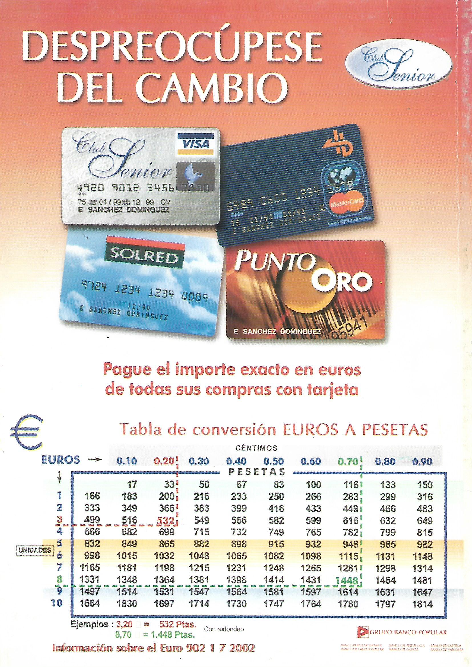 [ El día 1 de enero de 2002 se produjo la entrada en vigor de la nueva moneda que sustituía a la peseta. Los billetes eran comunes para todos los paises de la Comunidad Europea y su valor era de 5, 10, 15, 20, 50, 100, 200, y 500 euros, aunque la verdad es que los tres últimos, especialmente el de 500 euros parece ser que sí existe pero no creo que estemos muy relacionados con ellos. En este programa, el Banco Popular Español que casi siempre utilizó la contraportada del programa para su anuncio, la utilizó para insertar una tabla de conversión de Euros a pesetas, aunque muy pronto, y a nivel aproximado «para andar por casa», se utilizó la tabla del 6, es decir 6 euros 1000 ptas. ¡Cuántos quebraderos de cabeza con la nueva moneda! y qué decir con las pequeñinas de cobre ¡qué tela para los que no vemos bien!]