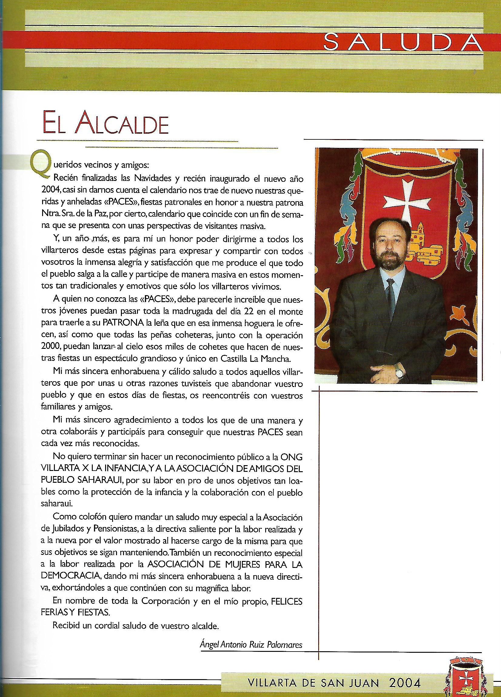 Programa de «Paces» del año 2004. Saluda del Alcalde (Fuente: Programas de festejos. Colección Particular)