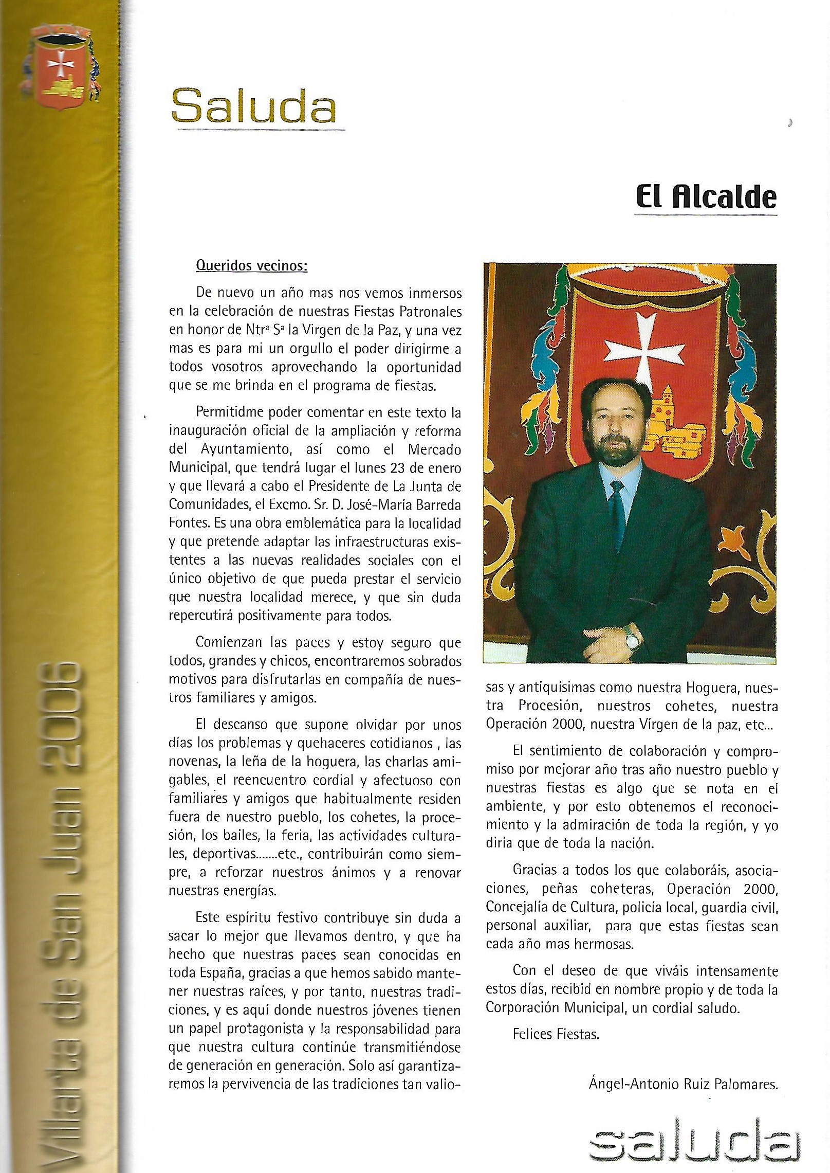 Se abre el programa con una foto de los reyes Juan Calos y Sofia que aparecerá durante los dos años siguientes, hasta que por problemas de protocolo, dejó de incorporarse. Ademas de esta foto comienza a publicarse los saludas de las autoridades autonómicas y provinciales: Presidente de Castilla-La Mancha ( José Bono), Gobernador Civil (Tomas Morcillo Cuenca) y Presidente de la Diputación Provincial (Francisco Ureña Prieto), terminando el saluda primordial de nuestro alcalde (Angel Antonio Ruiz Palomares.