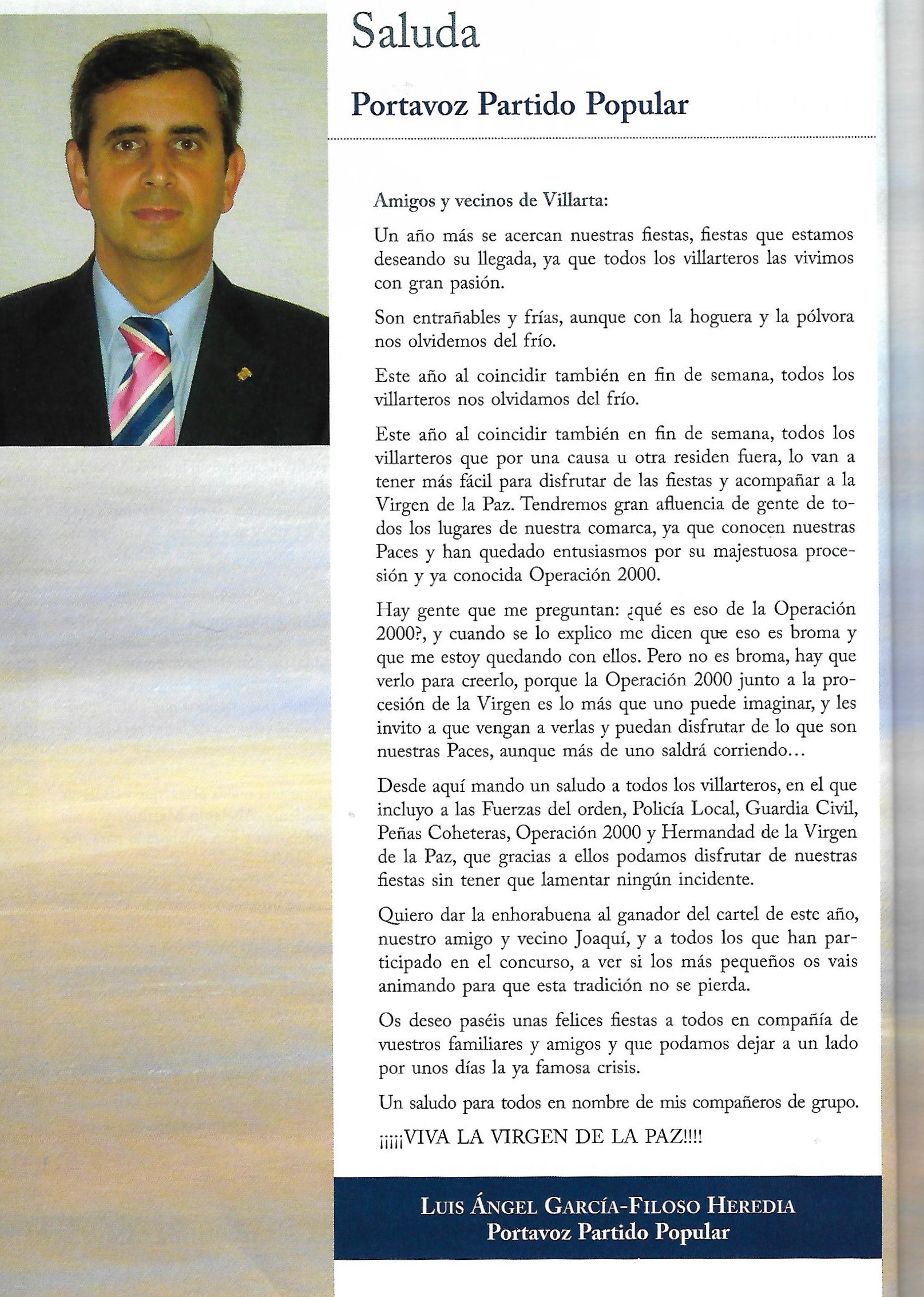 Programa de «Paces» del año 2002. Saluda del Portavoz del Partido Popular (Programa de festejos. Colección particular)
