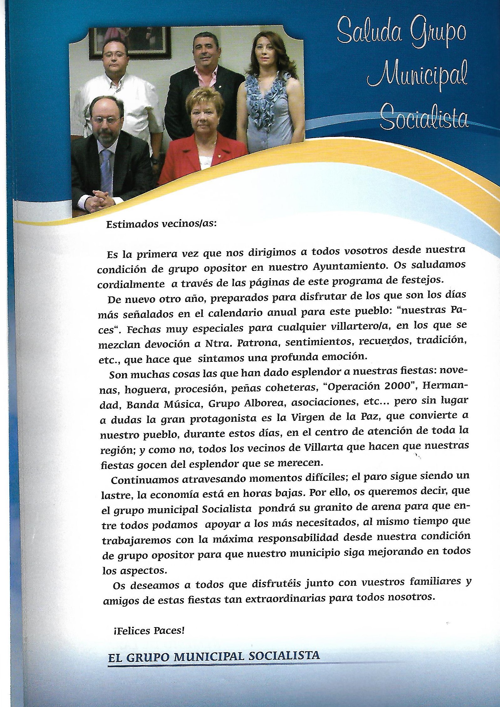 Programa de «Paces» del año 2012. Saludo del Grupo Municipal Socialista ( Programa de festejos. Colección particular)