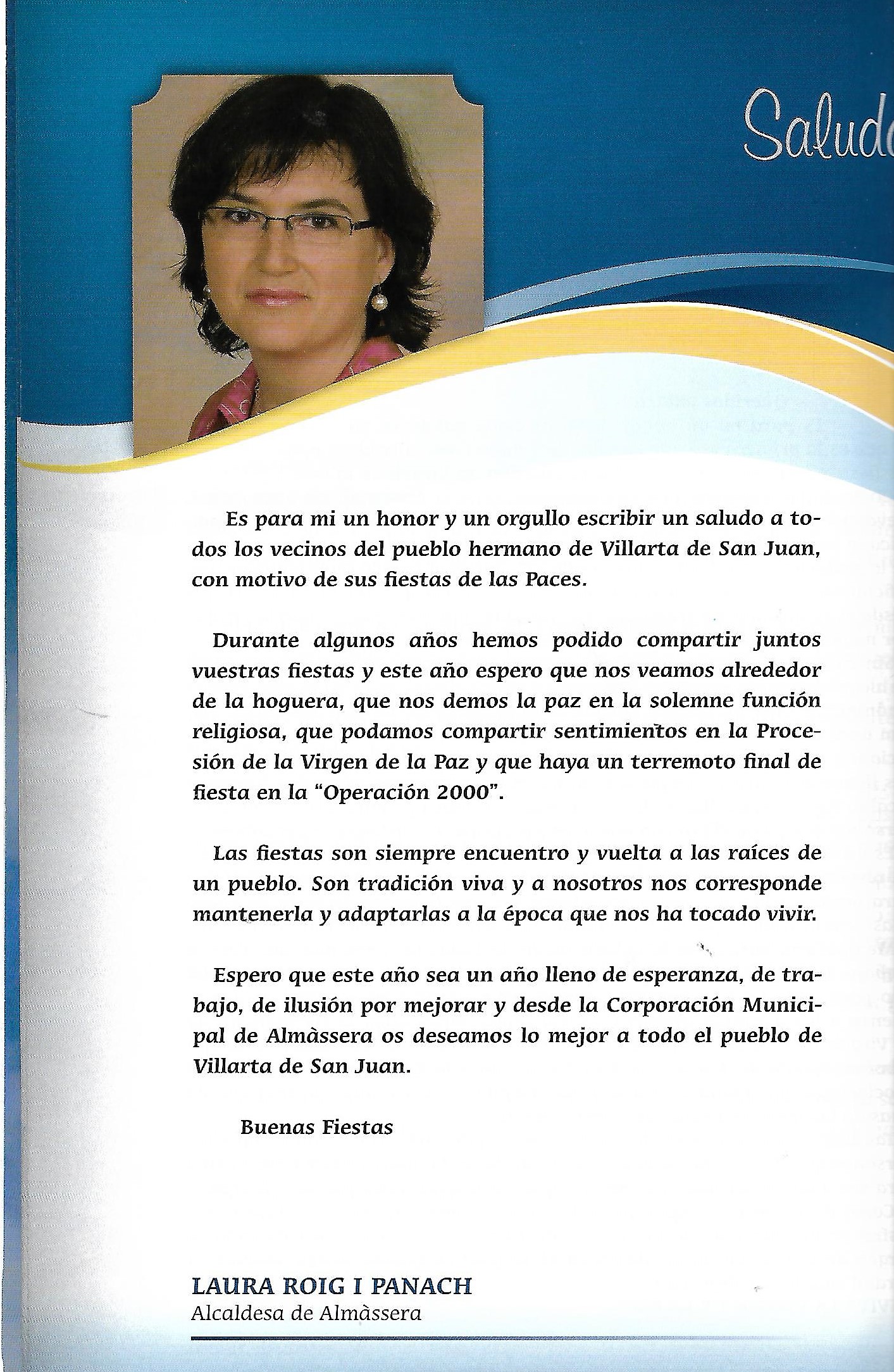 Programa de «Paces» del año 2012. Saluda de la Alcaldesa de Almàssera (Fuente: Programas de festejos. Colección particular)