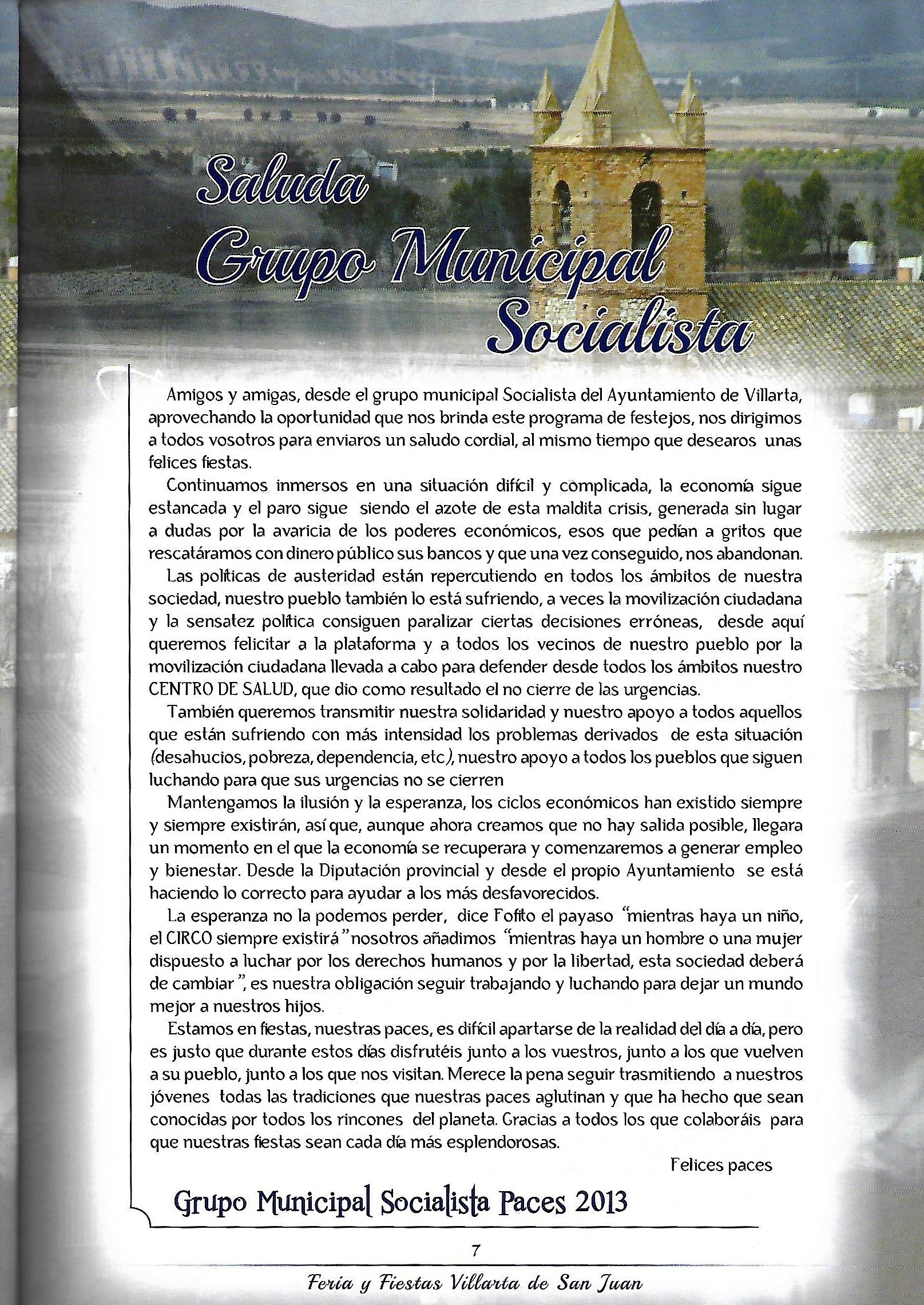 Programa de «Paces» del año 2013. Saluda del Grupo municipal Socialista (Fuente: Programas de festejos.Colección particular)