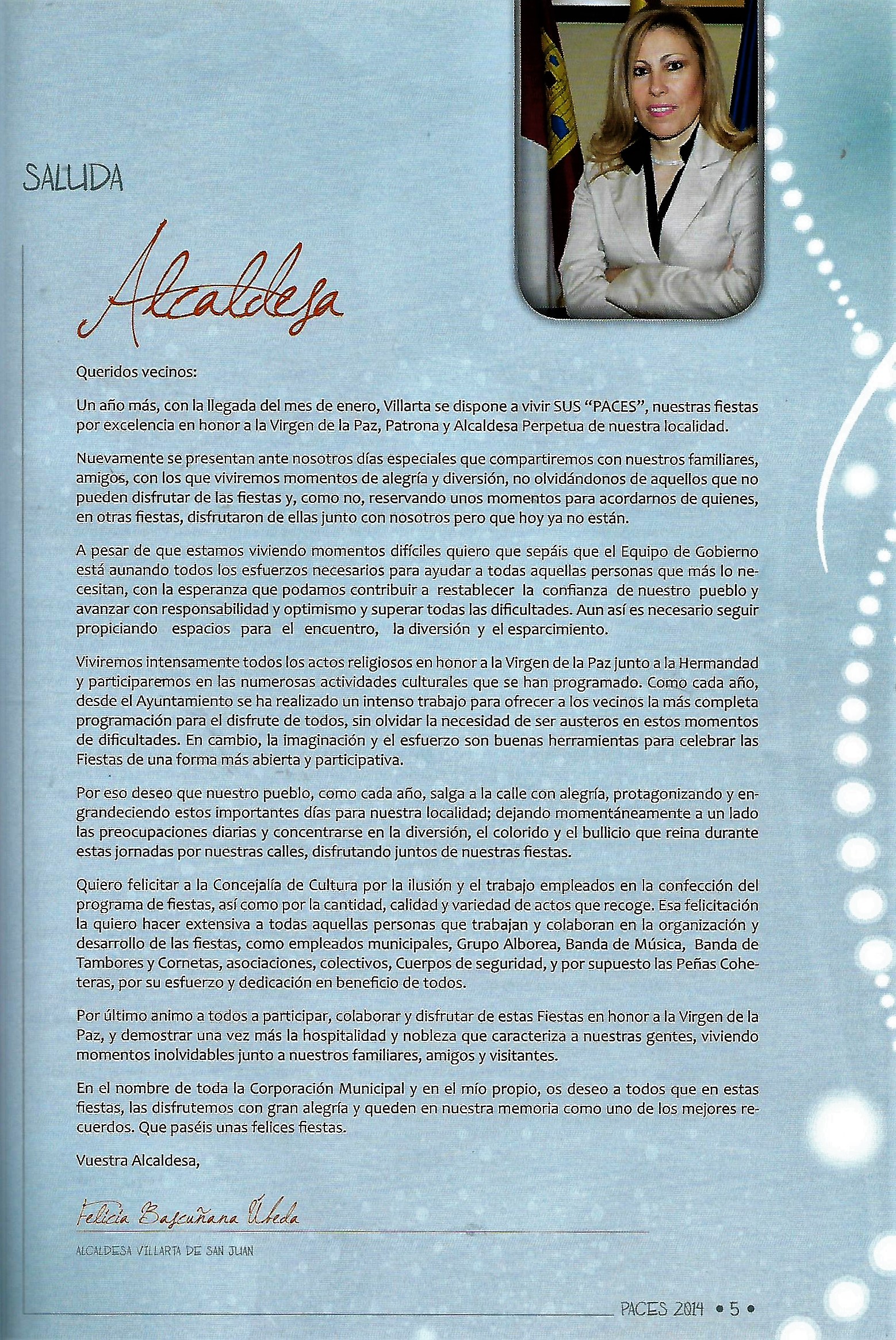 Programa de «Paces» del año 2014 Saluda de la Sra. Alcaldesa ( Fuente: Programa de festejos. Colección particular)