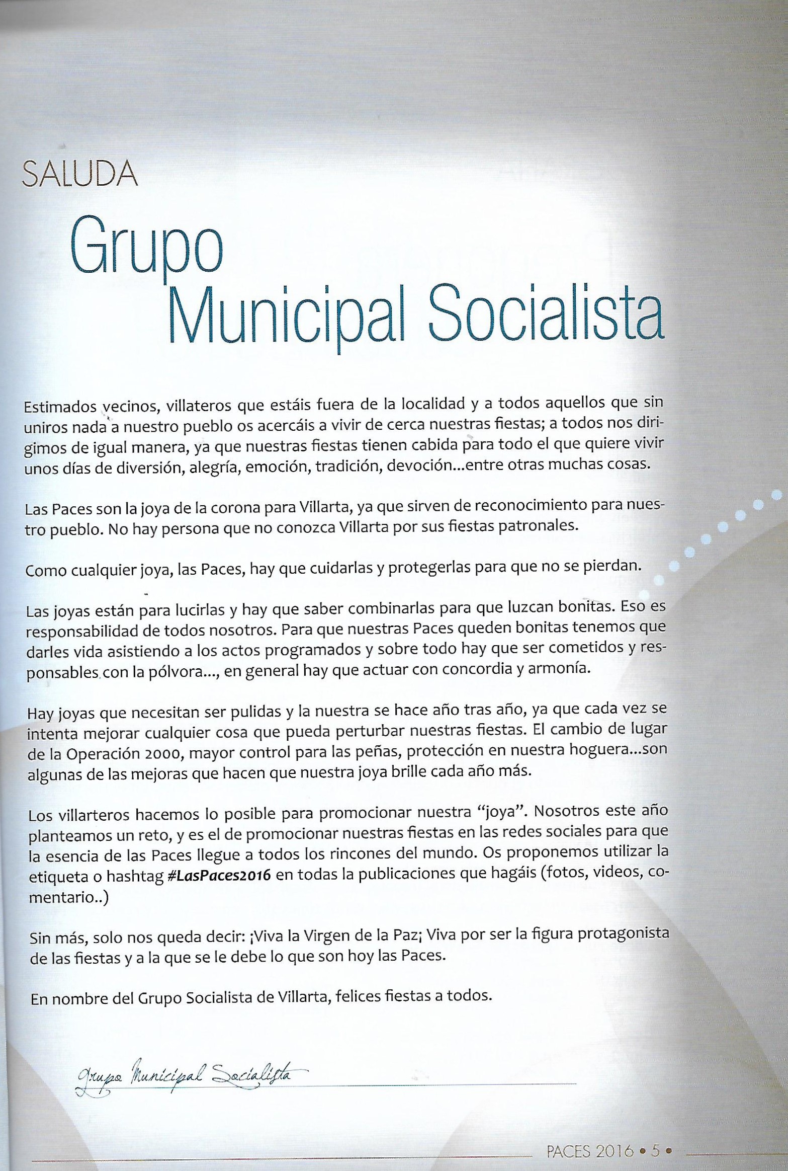 Programa de «Paces» del año 2016. Saluda de Grupo Municipal Socialista (Fuente: Programas de festejos. Colección particular)