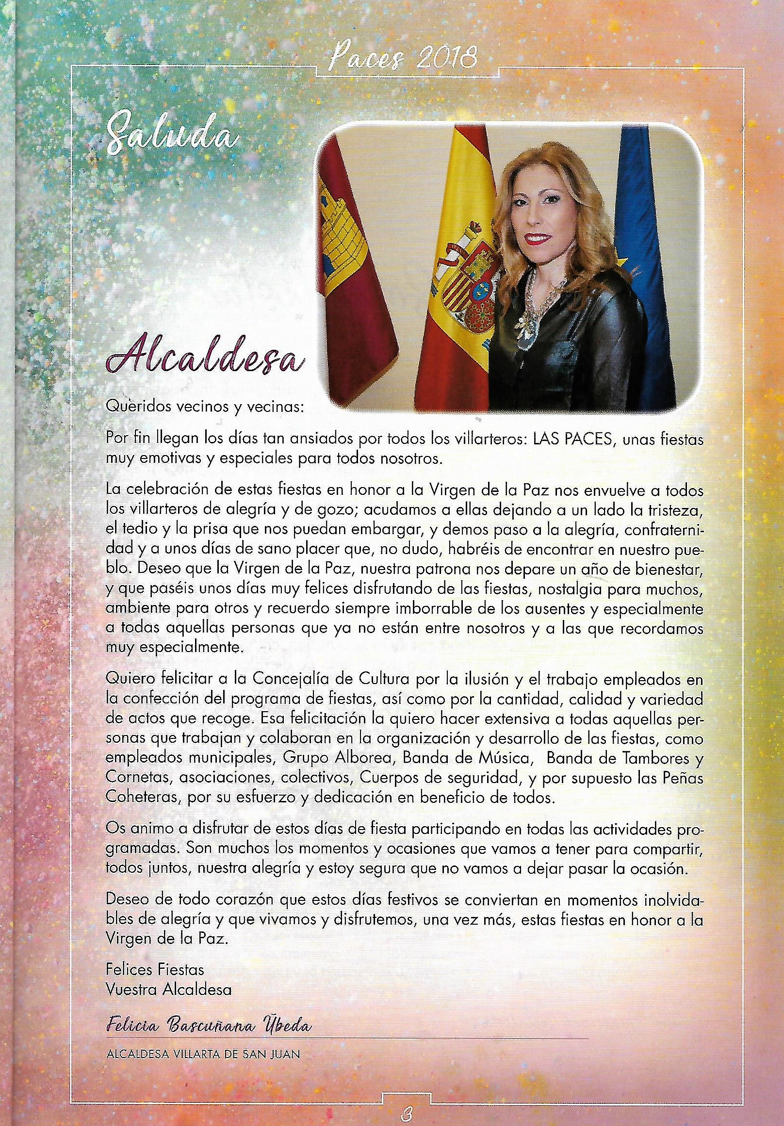 Programa de «Paces» del Año 2018. Saludo de la Sra. Alcaldesa ( Fuente: Programas de festejos. Colección particular)