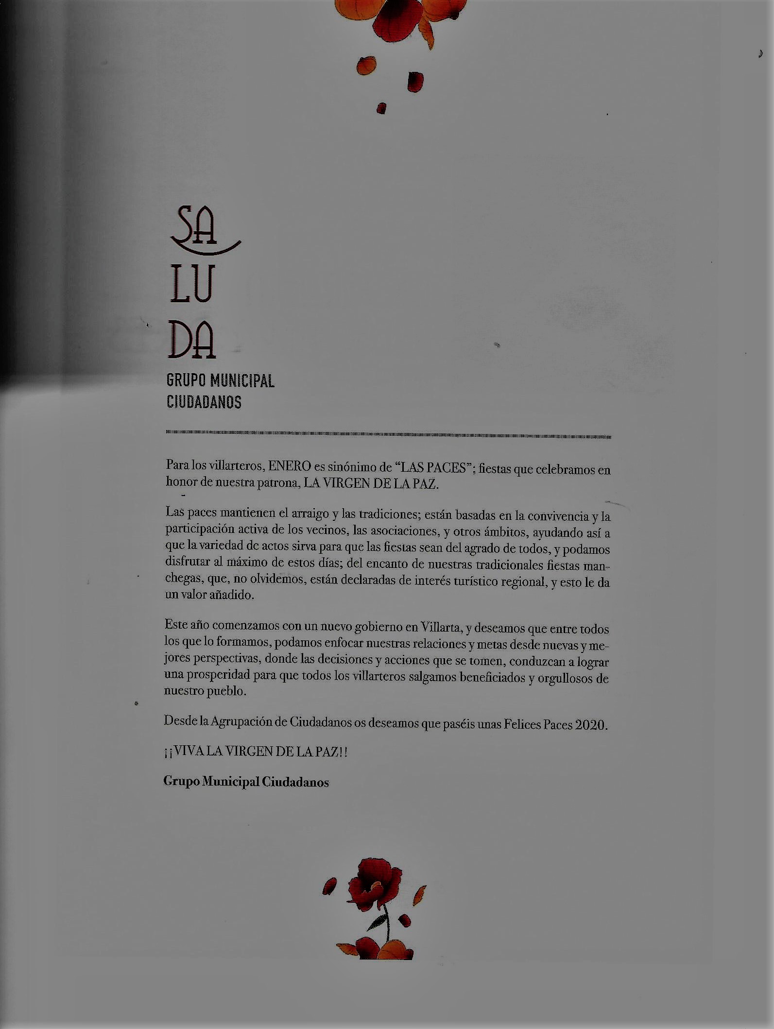 Programa de » Paces» del año 2020. Saluda del Grupo Municipal de Ciudadanos. ( Fuente: Programas de festejos. Colección particular)