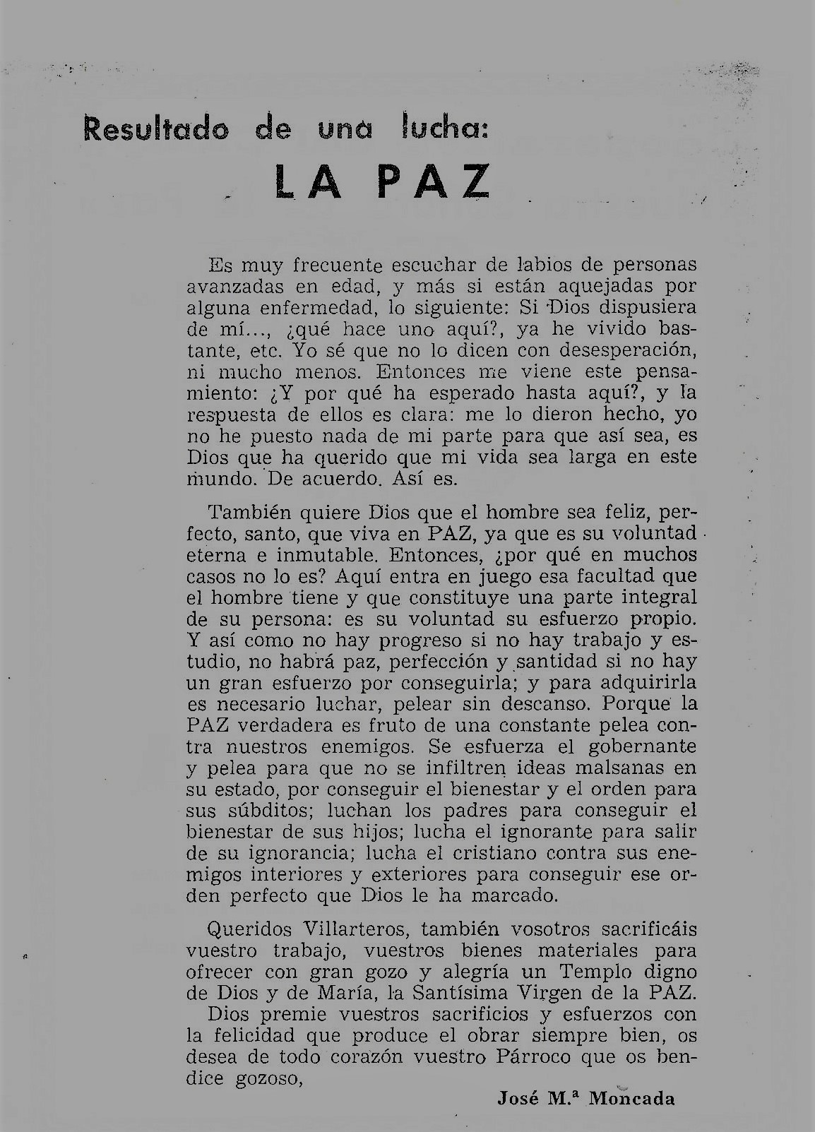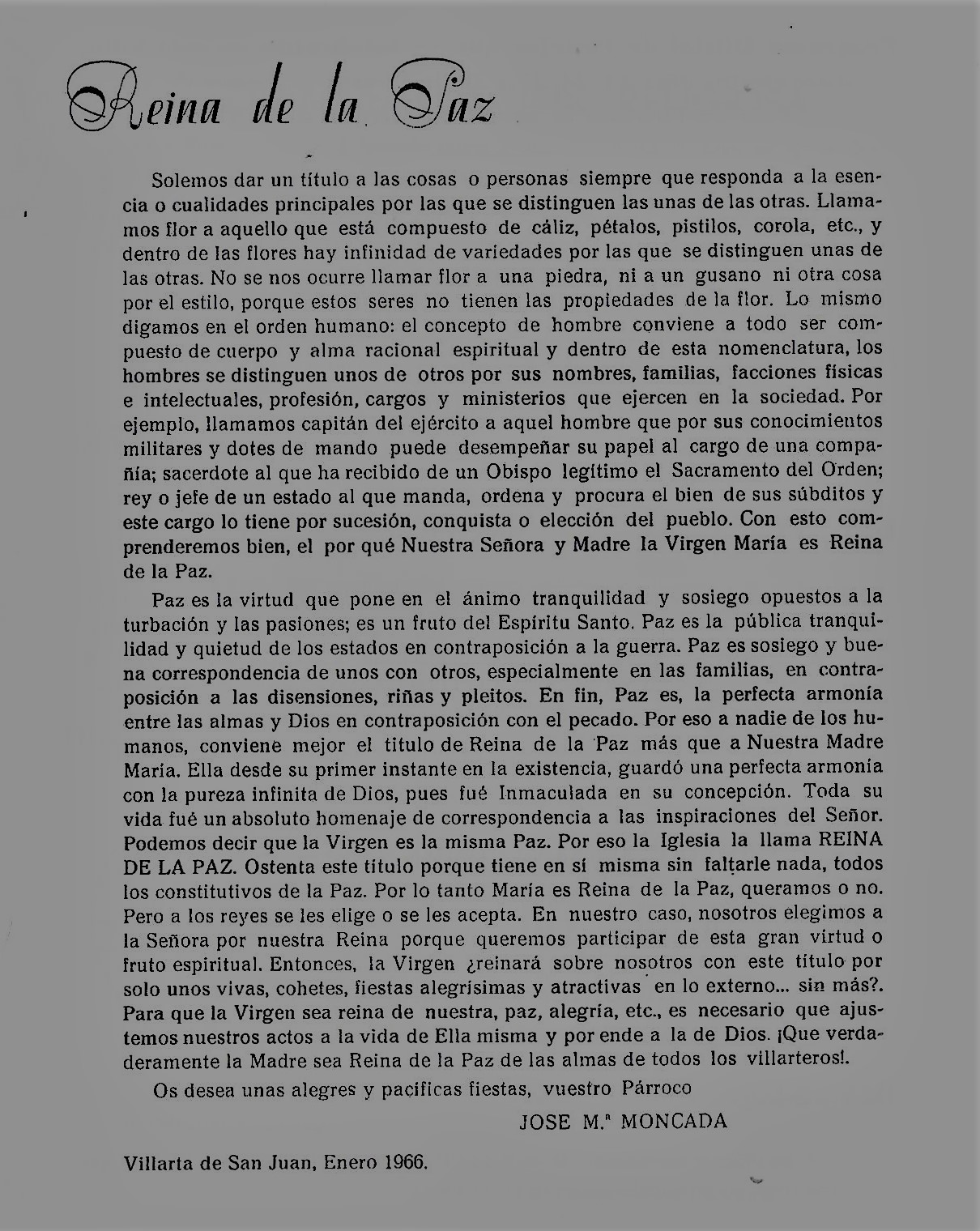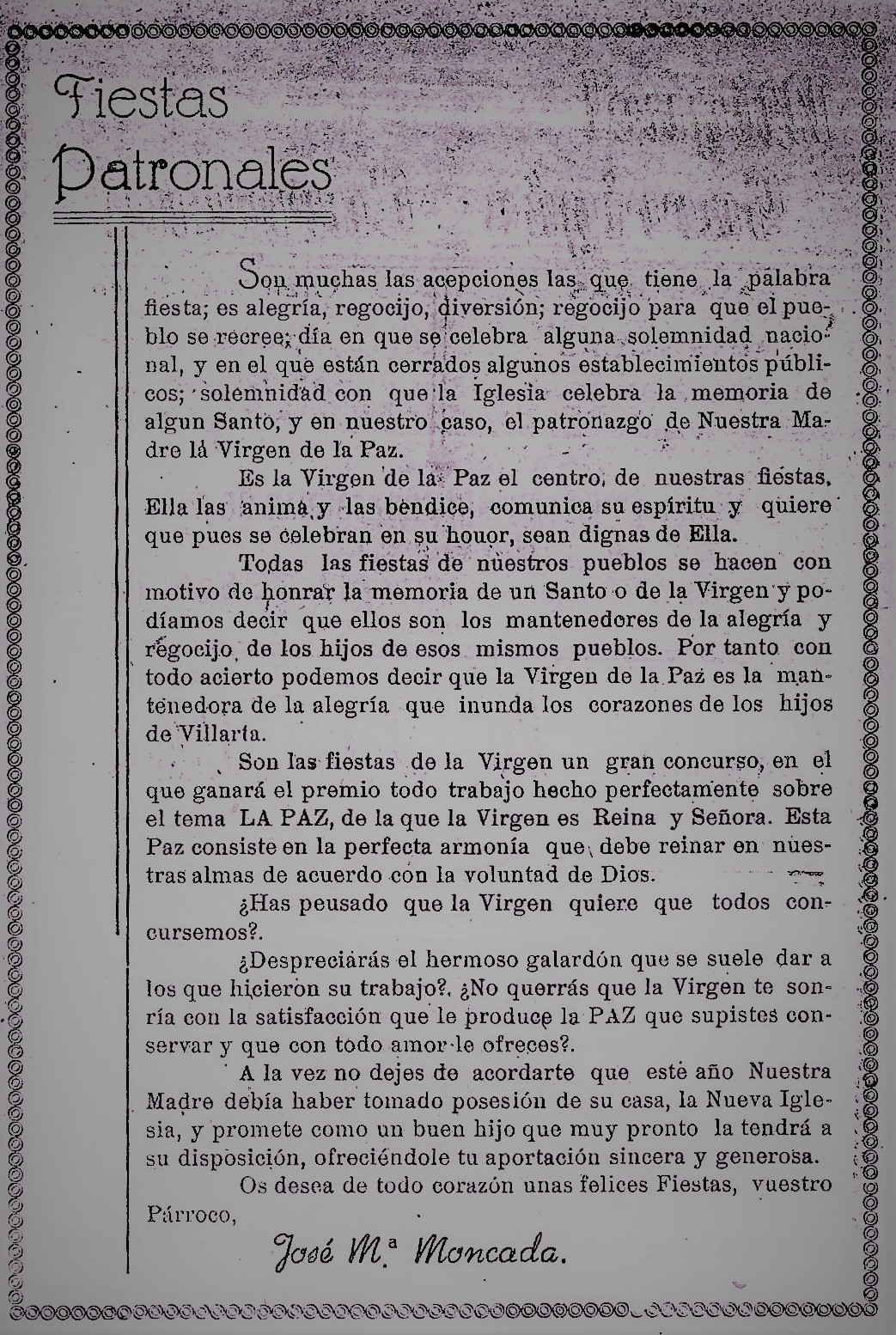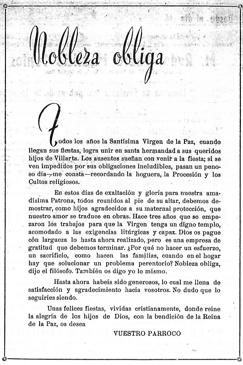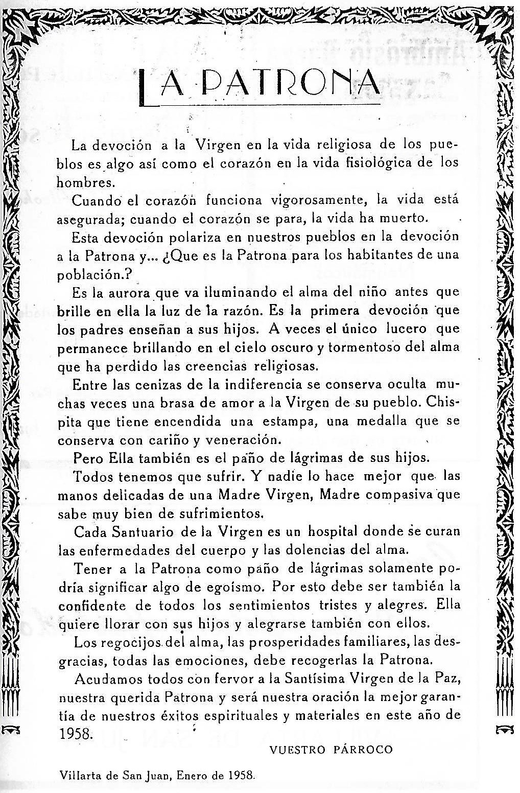 Me piden unas lineas para este Programa de festejos que de mano en mano irá fijando los ojos y abriendo el corazón de todos los buenos Villarteroa que se disponen a celebrar como nunca las fiestas de la Virgen nuestra Patrona la Santísima Virgen de la Paz, lineas que burla burlando van saliendo de la pluma sin otro objeto que el aportar mi grano de arena a estas hojas, voceras del entusiasmo de un pueblo en Fiestas. Y como he de decir algo, habida cuenta mi condición de Sacerdote, lo que he de decir no puede ser mas que esto: