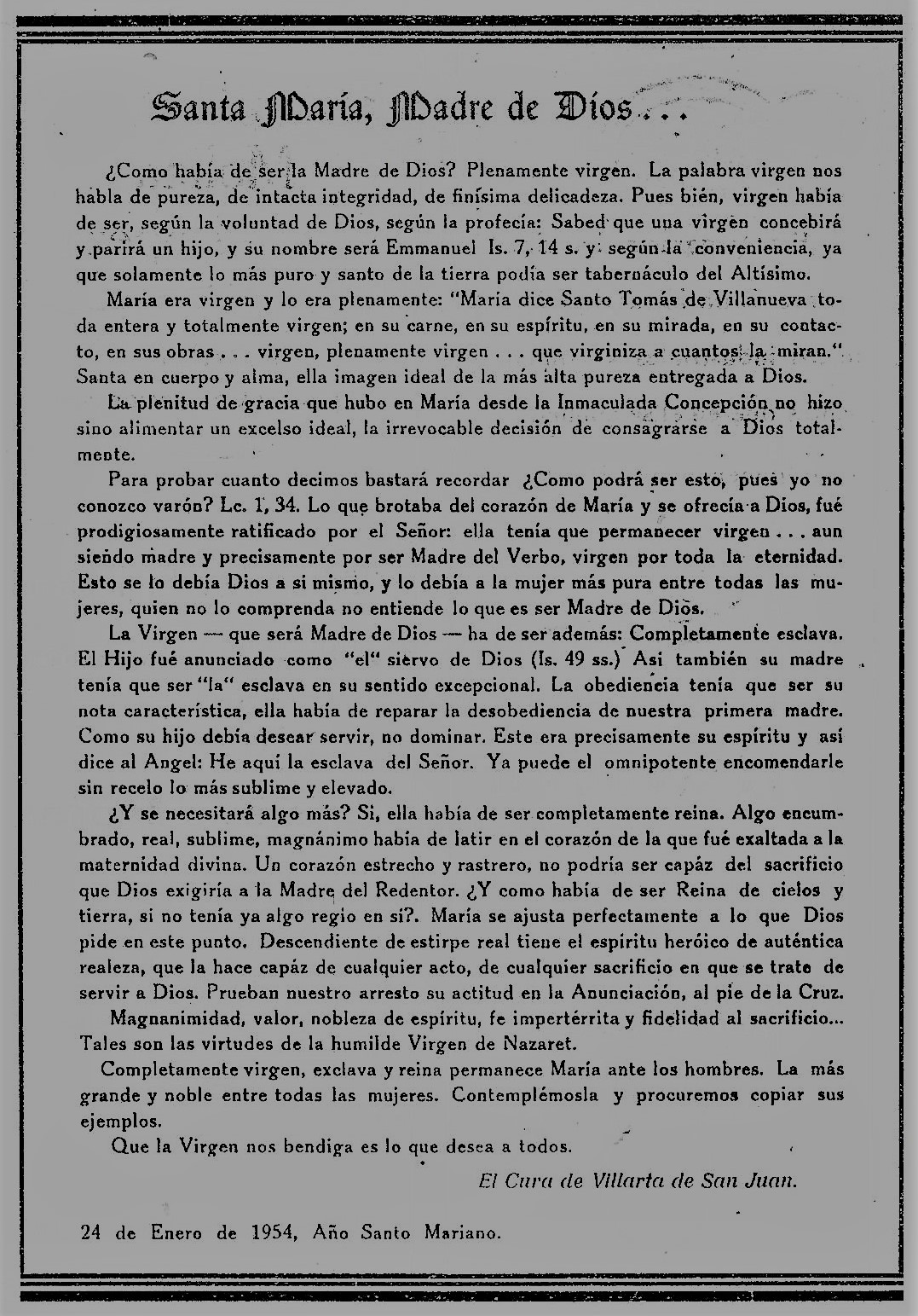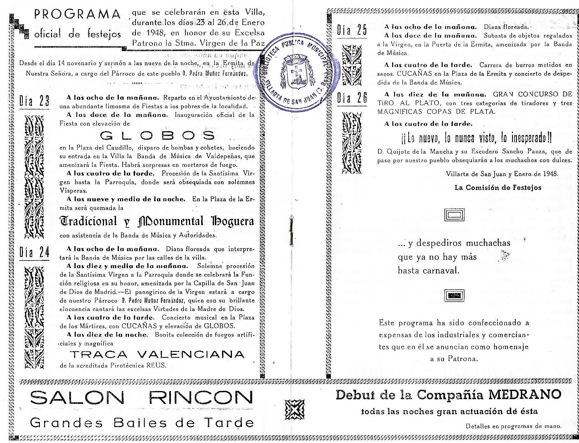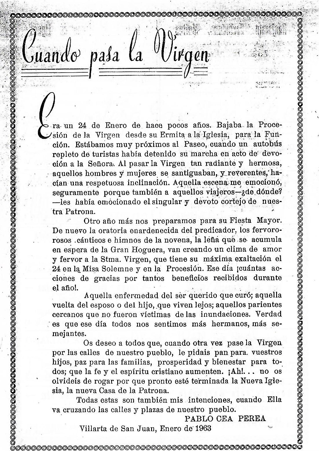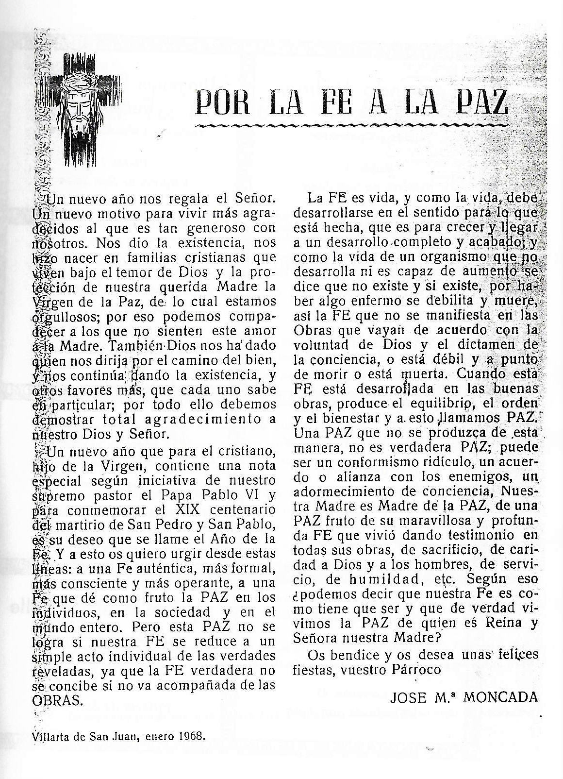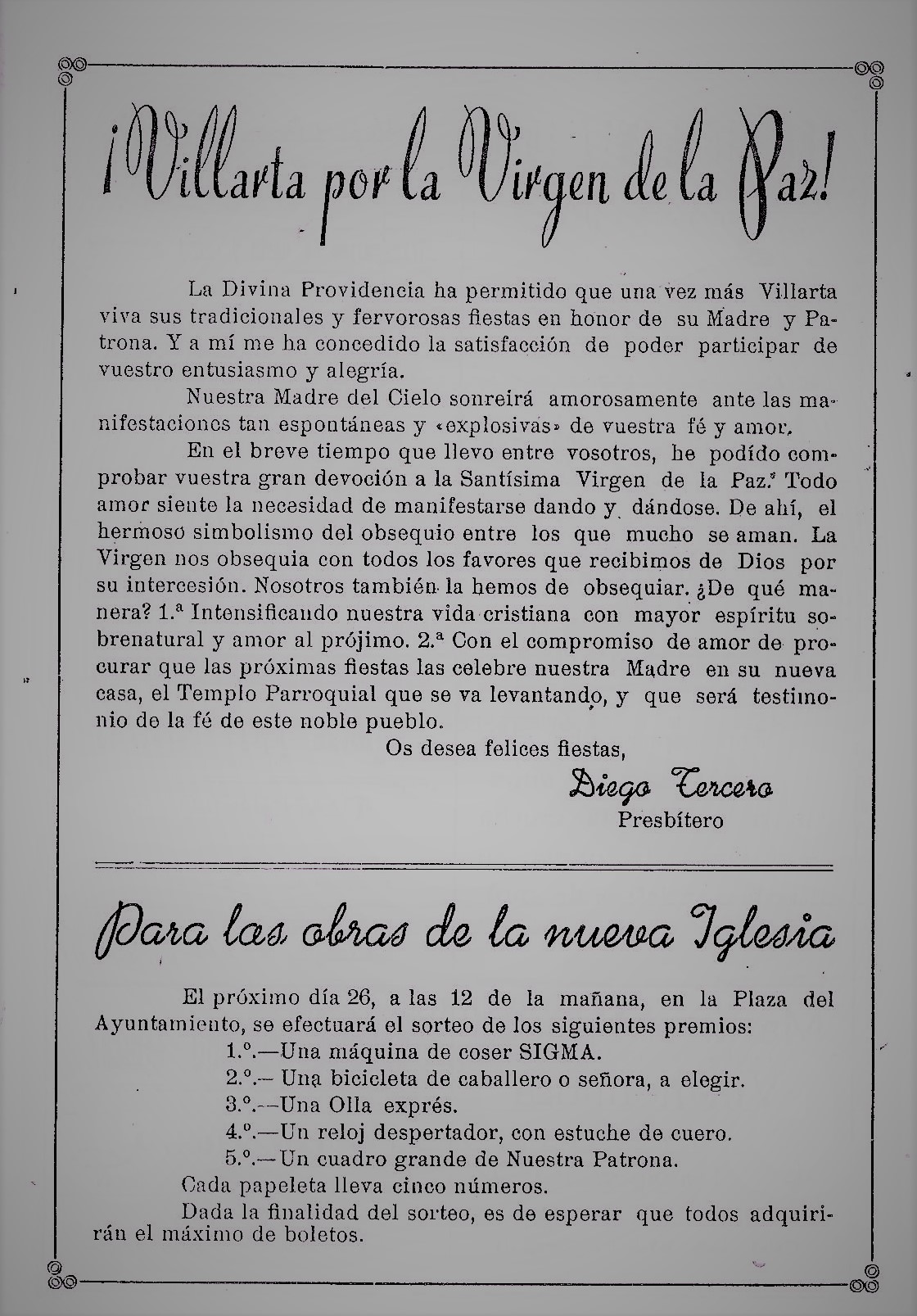 Me piden unas lineas para este Programa de festejos que de mano en mano irá fijando los ojos y abriendo el corazón de todos los buenos Villarteroa que se disponen a celebrar como nunca las fiestas de la Virgen nuestra Patrona la Santísima Virgen de la Paz, lineas que burla burlando van saliendo de la pluma sin otro objeto que el aportar mi grano de arena a estas hojas, voceras del entusiasmo de un pueblo en Fiestas. Y como he de decir algo, habida cuenta mi condición de Sacerdote, lo que he de decir no puede ser mas que esto: