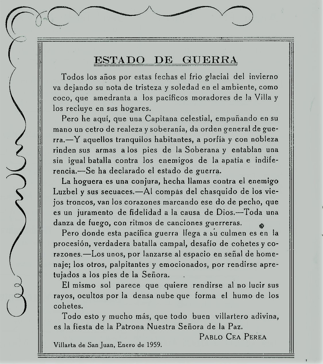Que se derrocha mucha pólvora, símbolo a mi parecer del férvido amaor a la Virgen, que estos días, espiritual y etéreo , se hace eso; fuego, aire, humo, que deja la tierra y sube arriba, arriba: dónde está la Virgen. Que el pueblo se divierte. Que las diversiones se entienden bien. Y esto es lo único, que yo quería decir y digo. Que al día siguiente de haber pasado las fiestas el alma de los Villarteros no sienta como un peso, que la fe de los hijos de este simpático pueblo no se vea entenebrecida; que los ojos de los buenos creyentes no tengan que llorar. Que una sola cosa es la que vale: el Alma. Y esta muy rara vez sale limpia y sin mancha al día siguiente de la fiesta de un pueblo. Para que la Virgen sea como sombra protectora a cuyo amparo sus buenos hijos se sientan alegres, contentos, pero… como llevados de su mano, hago mi deseo grito, al decir con edl alma en lo que digo: ¡VIVA LA VIRGEN DE LA PAZ!«