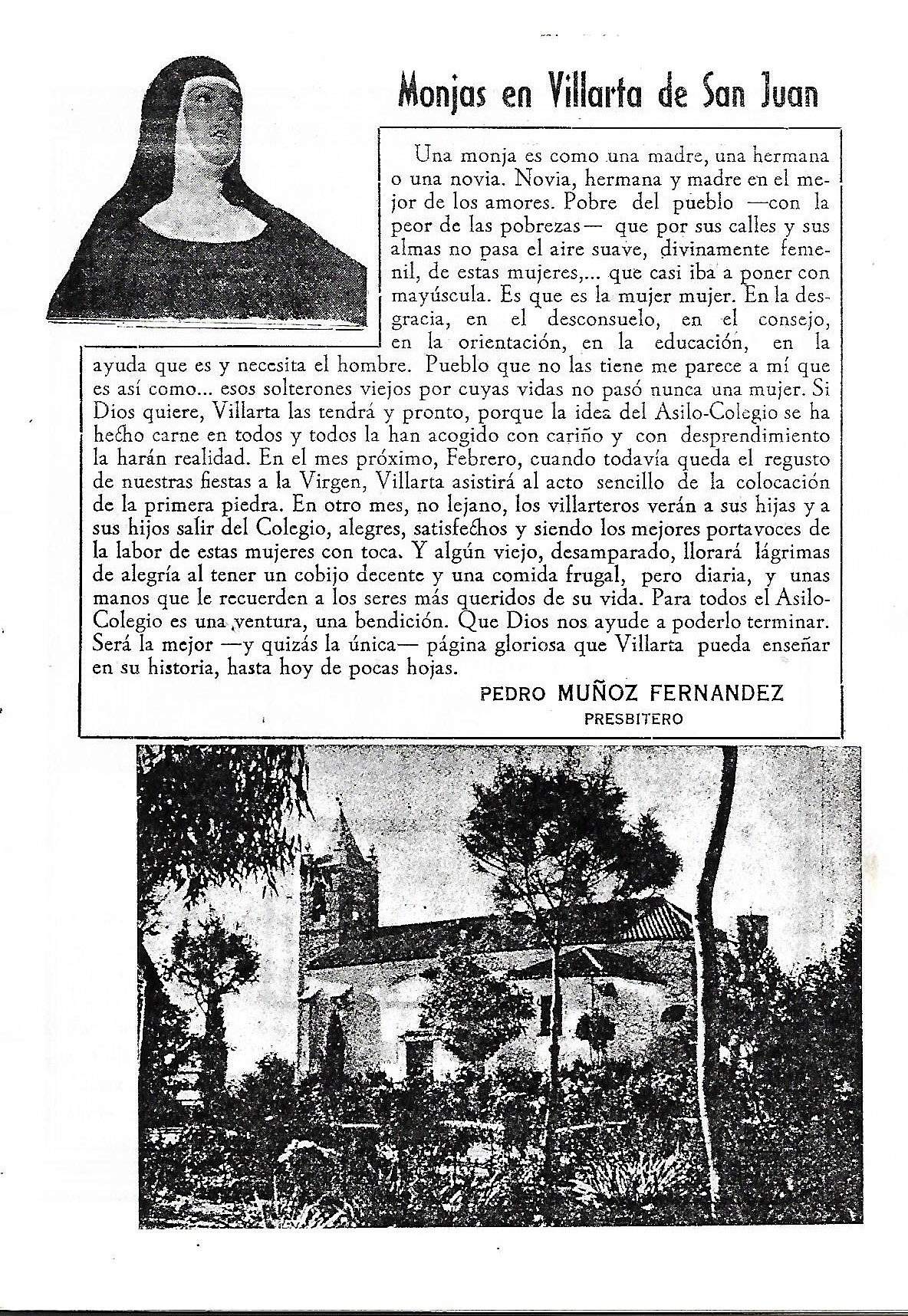 Cómo podemos ver en el programa oficial de festejos, el nuevo párroco de Villarta era D. Pedro Muñoz Fernández, quien será asimismo el encargado de celebrar el novenario de la Virgen y la función religiosa del día 24 con asistencia de la Capilla de San Juan de Dios de Madrid (No hemos podido identificar si era la Basilica de San Juan de Dios o del Asilo de San Juan de Dios. El escrito del párroco decía así: