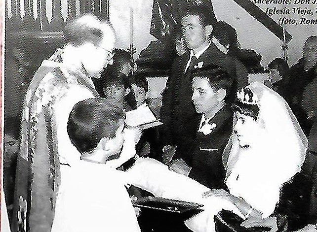 Don José María celebrando la boda de Vicente Morcillo y Mª del Carmen Moreno, en la Iglesia de Santa María (Fuente: Programa de «paces» del año 2018. Colección particular)