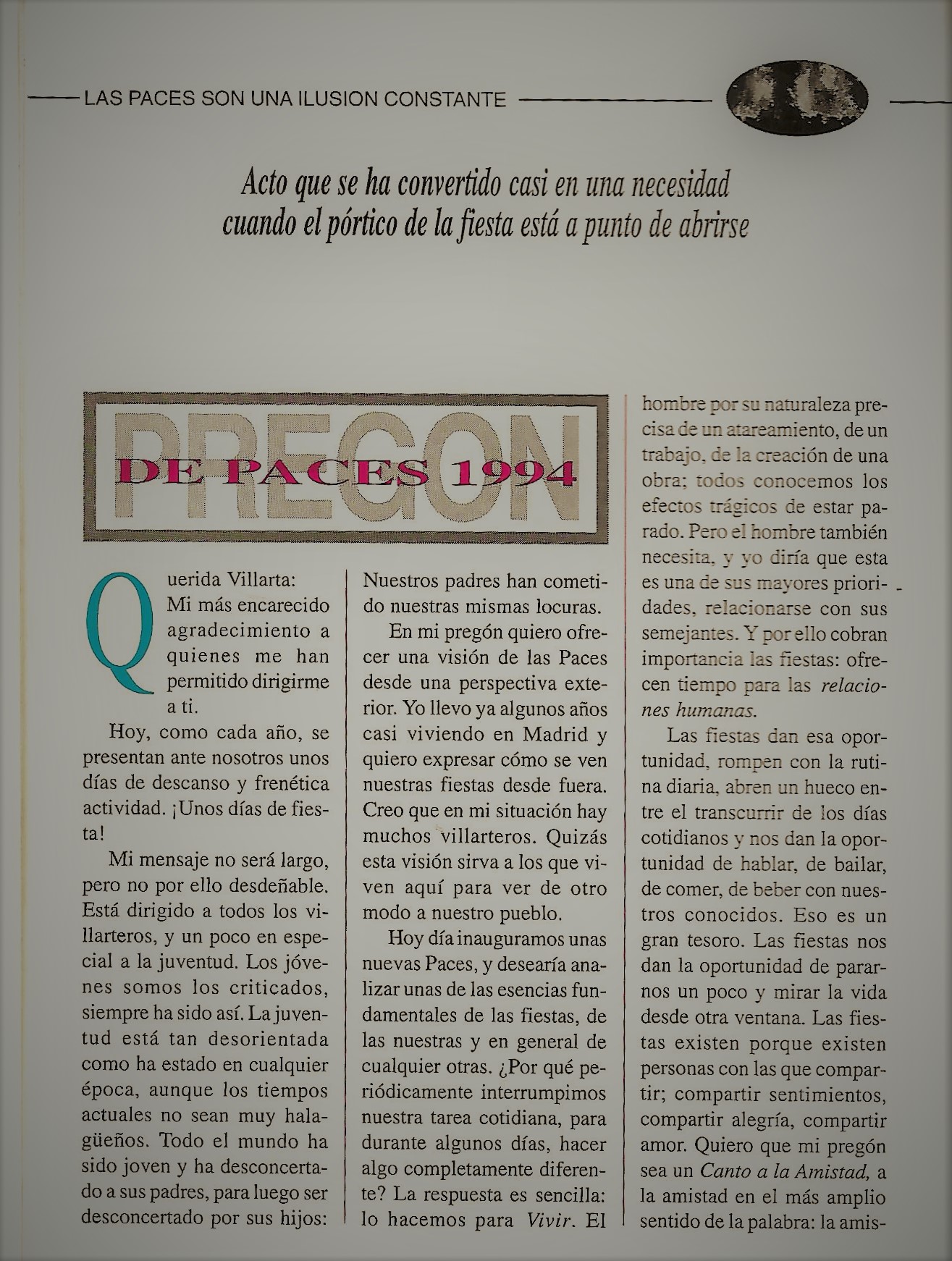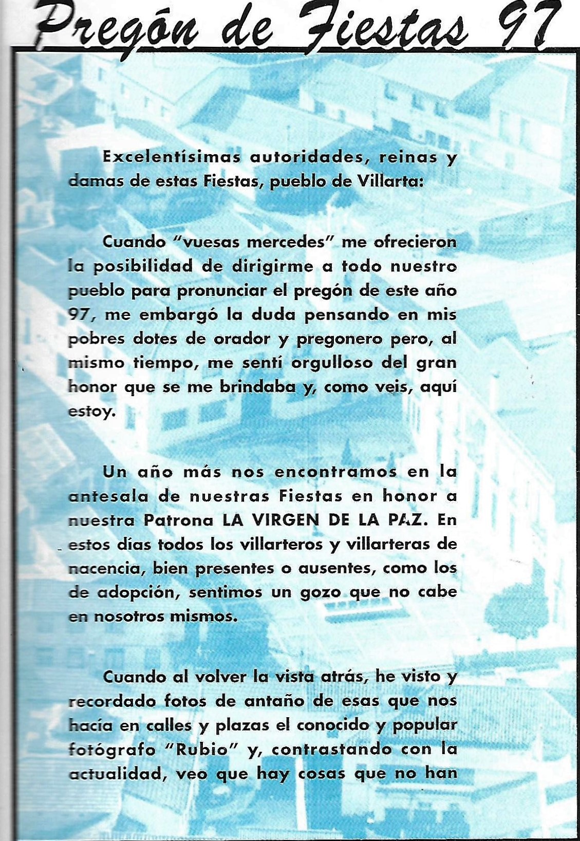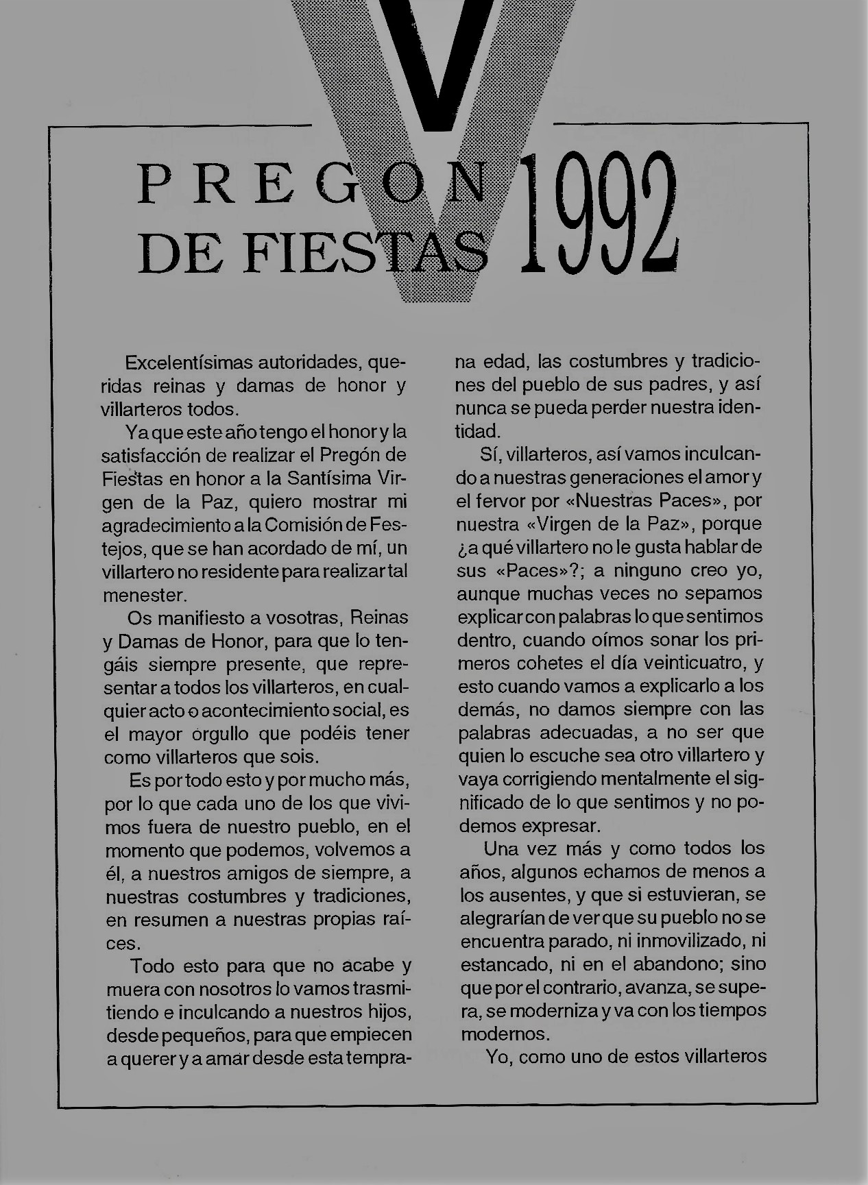 A partir del programa de festejos de este año 1991, salvo algún imprevisto, se publica el pregón de Fiestas del años anterior.