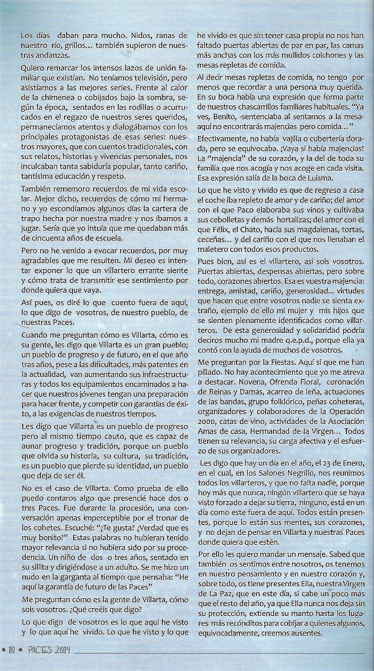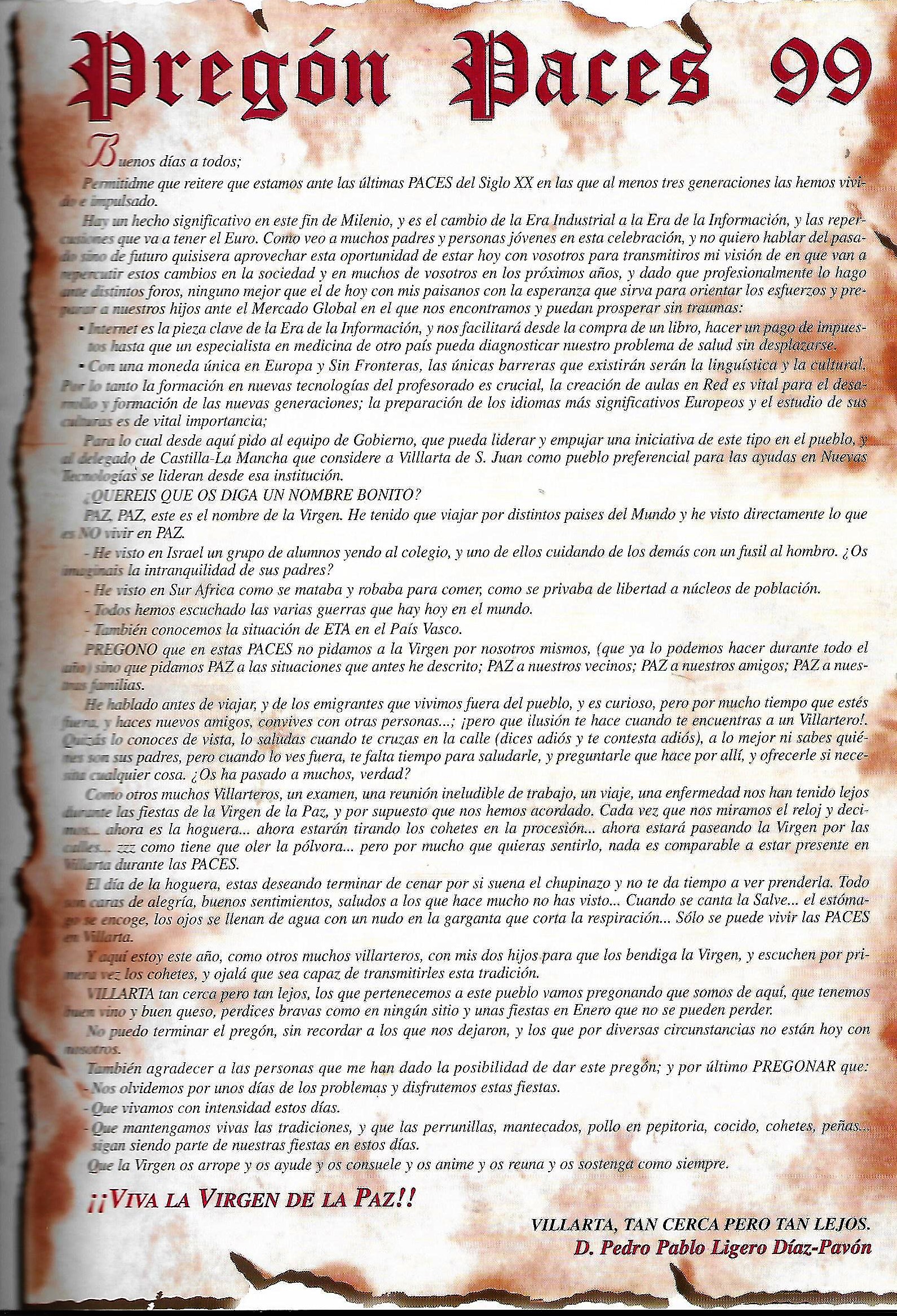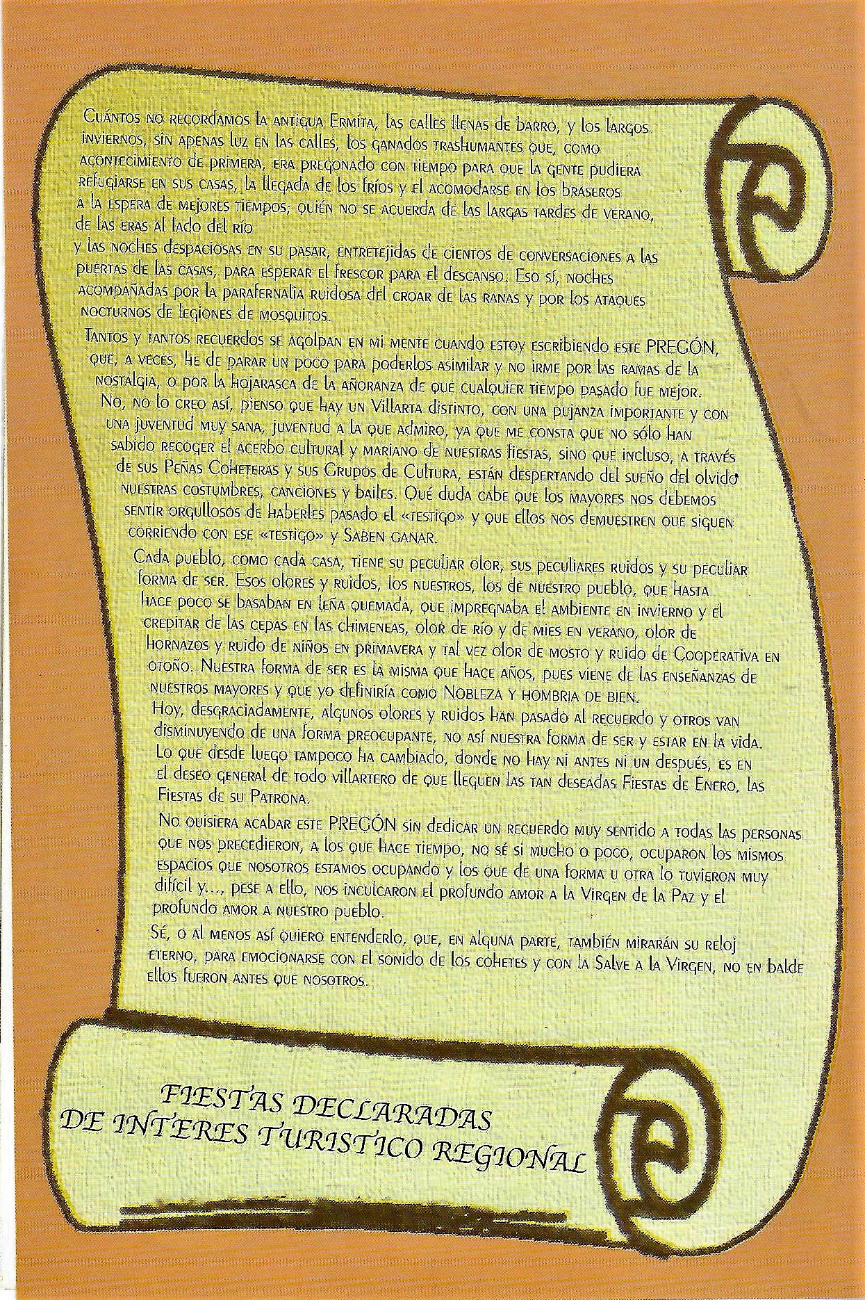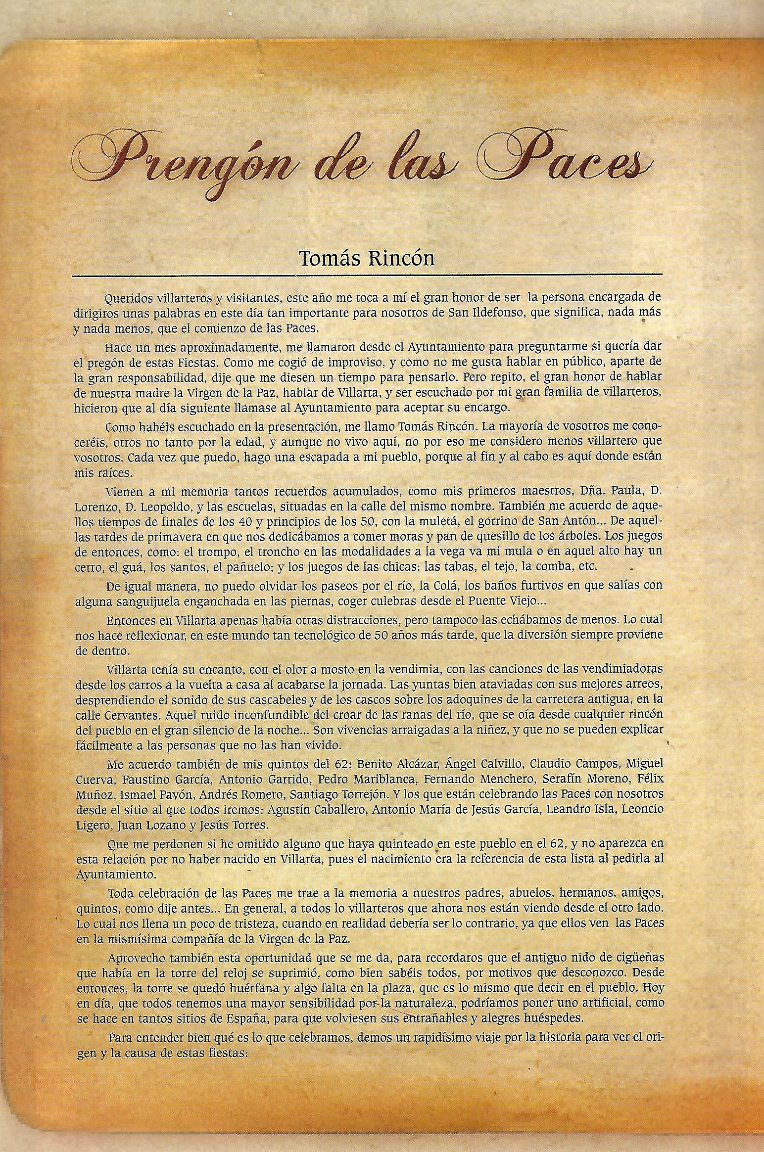 Solo para terminar este larguísimo preámbulo hacer una indicación que se recogía acerca de los pregones de Paces y de sus pregoneros. La nota decía así: «El pregón de fiestas ha tenido como pricipal característica la de ser pronunciado siempre por gente de Villarta, salvo en una ocasión, que invitado un conocido gronista de la provincia, no pudo celebrarlo por cierto malestar producido entre los presentes en el acto, ya que siempre se ha mentenido la costumbre de hablar de las Paces y para ello como aquí se dice vulgarmente, se han tenido que mamar desde pequeños. Es lógico, por tanto, que el aspecto literario de los mismos no sea su principal característica, sino mas bien su emotividad, sencillez y apasionamiento. En otros, -no citados algunos en el programa- podemos citar como pregoneros a: Alfonso Rincón Serrano, José Muñoz Torres ( sustituyendo al inolvidable José Pérez Archidona que no pudo hacer su pregón por enfermedad), José Gerardo Muñoz Isla y María Paz Muñoz Camacho (esta última a cargo de un inolvidable pregón infantil), José Menchero Torres… [JOSE MUÑOZ TORRES. Paces en el recuerdo, 50 años de programas de festejos] y todos los que a partir de la década de los 90 fueron aparenciendo, publicandose su pregón en el programa del año siguiente.